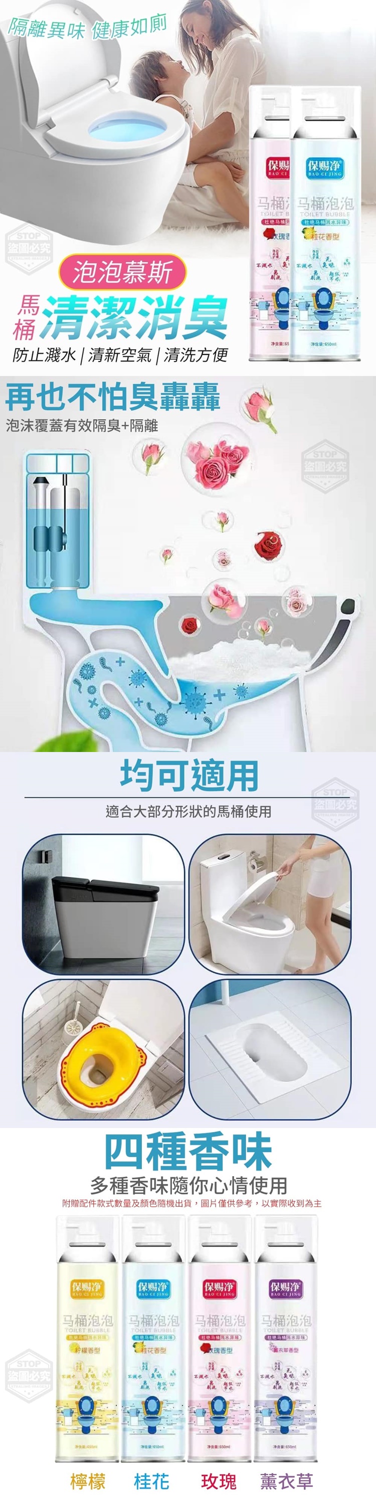 【商品顏色】檸檬、桂花、玫瑰、薰衣草 (附贈配件款式數量及顏色隨機出貨, 圖片僅供參考,以實際收到為主。) 【商品說明】- 馬桶清潔消臭泡泡慕斯 使用泡泡,防止花濺起乾淨衛生 還能隔絕異味,防止臭氣擴散 還你清新空氣, 多種香味隨你心情使用~ 防止濺水 安心如廁 藍色泡泡,覆蓋馬桶水面迅速包裹排泄物 防水濺水,降低如廁感染 再也不怕臭轟轟 泡沫水有效隔臭+隔離 直接沖洗 去污去垢 如廁後直接沖洗 潔淨無殘留 均可適用 適合大部分形狀的馬桶使用 >防止濺水 >清新空氣 >清洗方便