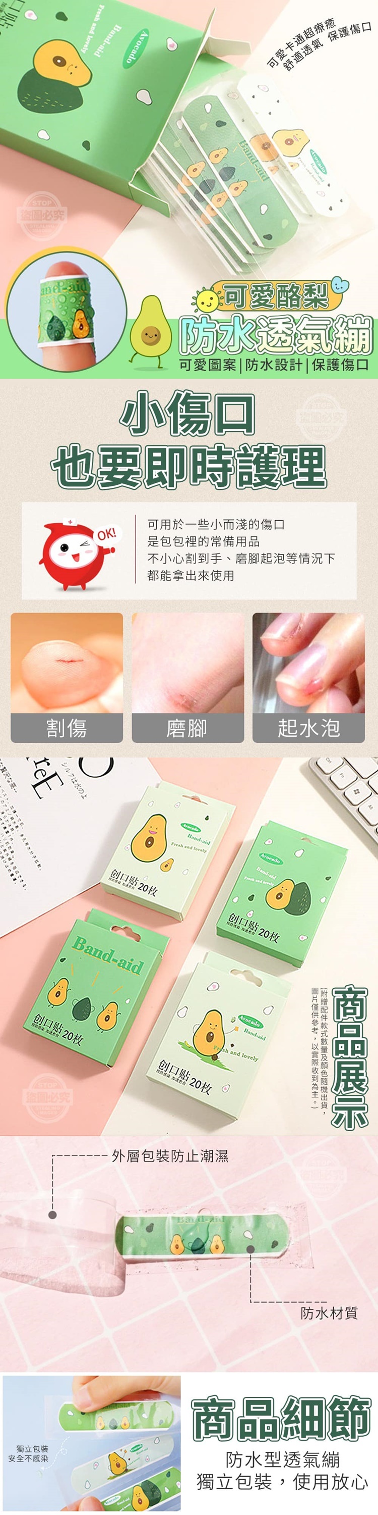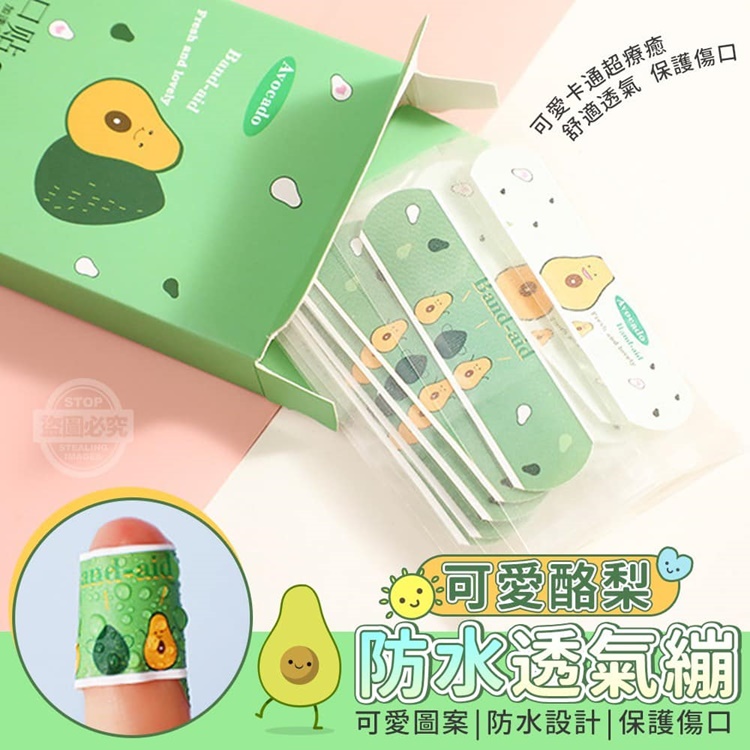 【商品說明】- 生活中總有些小意外 不小心割傷、跌倒等等 您需要超可愛的酪梨防水透氣繃 可愛的卡通酪梨圖案Q萌~Q萌~ 不管大人還是小孩看了都會覺得超級療癒的~ 人人搶著要的就是這↓ 時尚潮色的防水透氣繃 透氣防水 保護傷口 不用擔心傷口被水濺到, 有效預防感染!! 日常、居家、辦公、學校、戶外活動 一定都需要備著,快快買起來!!!