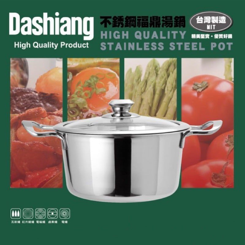 中秋節特惠 台灣製造品質保證 末售價請勿低於499元 Dashiang不銹鋼福鼎湯鍋24CM (DS-B33-24) 匠心設計,款式精美時尚, 彰顯現代家庭生活品味。 採用304(18-8)不銹鋼精工細做, 耐腐耐磨,經久耐用。 全鋼金屬鍛造雙耳手柄款式設計, 堅實耐用更安全。 可視玻璃上蓋設計, 可隨時掌握食物烹調的最佳狀態。 鍋身內外鏡面拋光效果處理, 不易臟汙好清洗。 導熱迅速且均勻,不易黏鍋糊底, 熱效率更高,滿足現代生活需要。 可適用於瓦斯爐、紅外爐、 電爐、鹵素爐、電爐使用。 材 質:#304不銹鋼/強化玻璃蓋 製造日期:2016年1月15日 保存日期:正常使用下無特殊保存期限 產 地:台灣