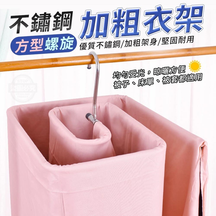 【商品材質】-不鏽鋼 【商品尺寸】-加粗12mm (尺寸為手工測量, 誤差尺寸±20mm為國際驗貨標準可接受範圍) 【商品說明】- 你是否有以下這些問題? 沒有陽台,無法懸掛晾曬 風大下雨,棉被容易掉落弄髒 晾曬面積太大,太佔空間 只曬單面,光照不足 曬被子不用這麼麻煩~ 可折疊方型螺旋加粗衣架 全方位懸空,打破傳統晾曬方式 螺旋設計,懸空通風好 自然風加速曬乾被子 且還很節省空間 讓晾曬變得更方便 採用優質不鏽鋼材質 加粗12mm,非常堅固耐用 使用完畢後 掛桿可折疊收納喔!