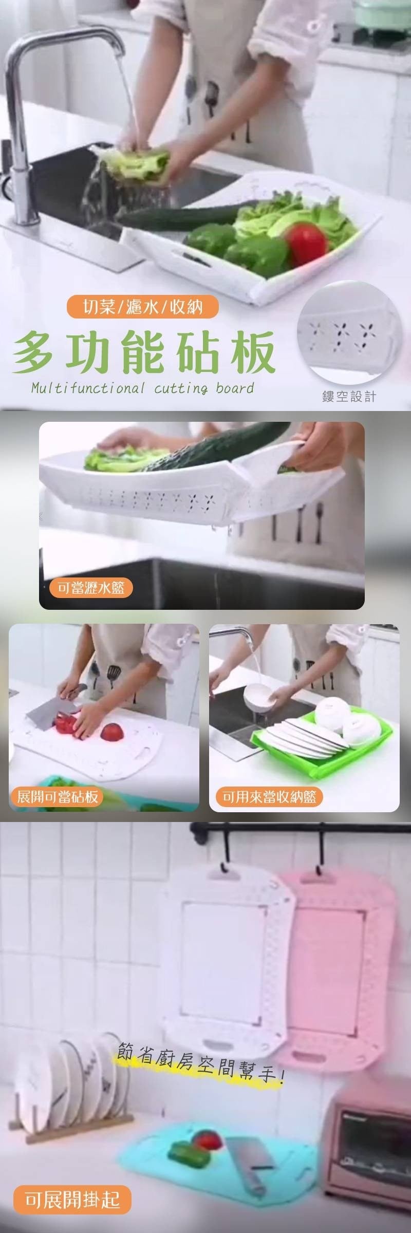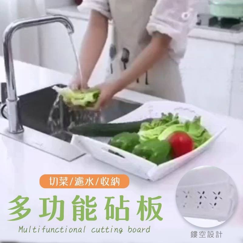 切菜→洗菜→收納 多功能砧板來囉! 切完菜將四角扣起就能洗菜 鏤空設計能幫你把水濾掉 整個洗菜流程都幫你照顧到 不用一直中途換碟子、換盆子 省了好幾道功夫呢 省時間又省力氣 同時還能收納廚房其他碗碟 簡直萬用廚房幫手 展開就是砧板 扣起就能收納 蔬果濾水功能 顏色: 隨機不挑(白色為主)