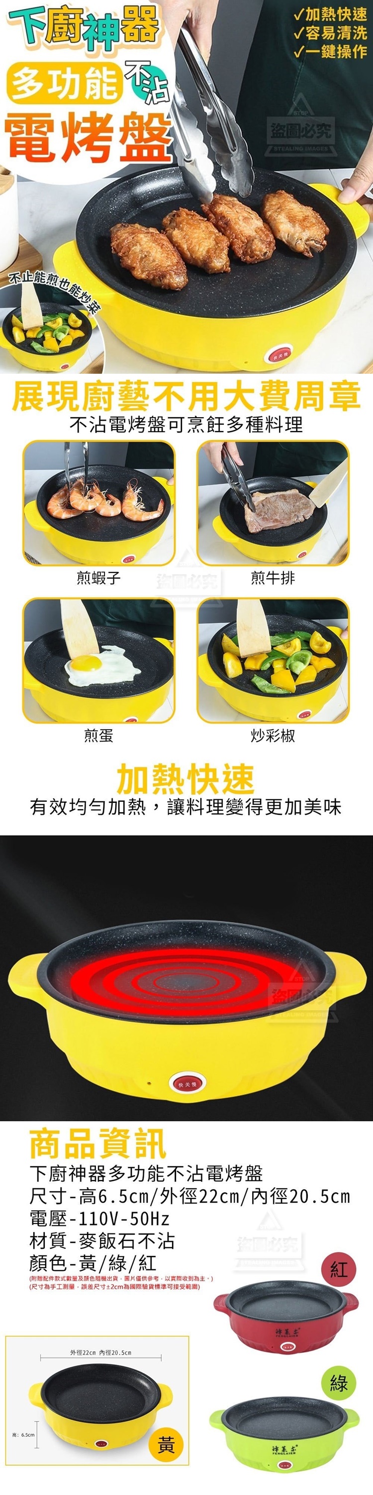 【額定電壓】-110V-50Hz【商品材質】-麥飯石不沾【商品尺寸】-高6.5cm/外徑22cm 內徑20.5cm【商品顏色】-黃/綠/紅(尺寸為手工測量,誤差尺寸±2cm為國際驗貨標準可接受範圍)(附贈配件款式數量及顏色隨機出貨,圖片僅供參考,以實際收到為主。)【商品說明】-