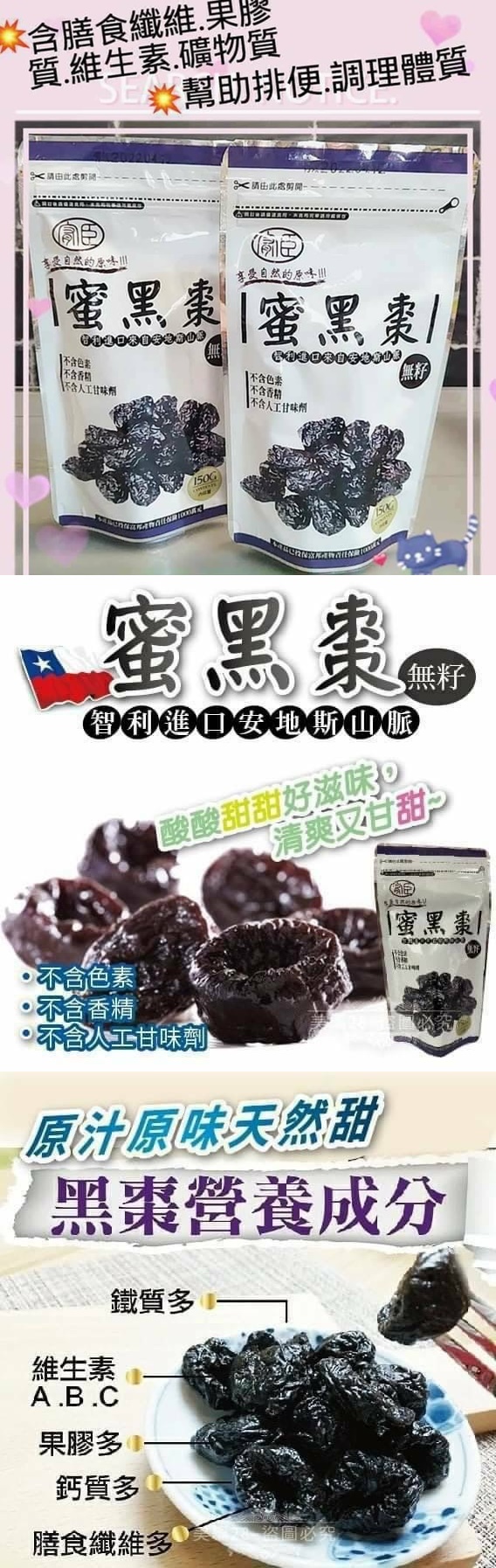 來自智利安地斯山脈 滋味酸甜清爽又甘甜 富含多種人體所需營養 維生素 鐵質 鈣質 膳食纖維 享受自然的原味 去籽且顆顆飽滿 不含色素 不含香精 不含人工甘味劑 最健康的小零嘴 幫助維持腸胃道機能 搭配優格也好吃 平價健康又美味 商品資訊 重量:約150g/包 產地:智利 包裝地:台灣 &最新效期&