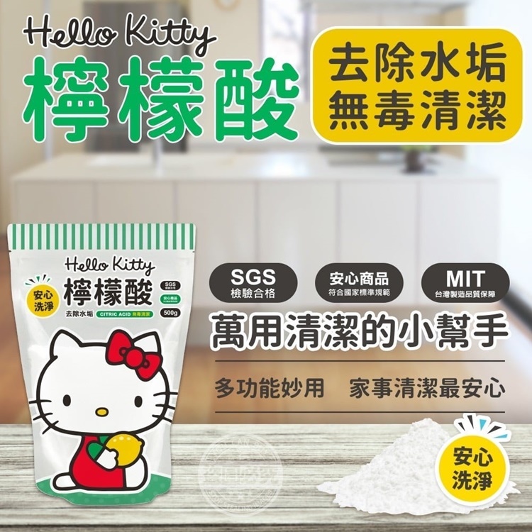 【商品說明】- 去除任何水漬污垢無毒清潔 就是這一款萬用清潔的小幫手 Hello Kitty檸檬酸 檢驗合格符合國家規範 而且是MIT製造,使用安全有保障! 讓你洗淨更安心 弱鹼性 去髒汙 解油漬 除異臭 洗淨無殘留 自然分解 加強清潔洗淨力安全無汙染~ 萬用妙寶 洗衣時加入檸檬酸,曾加洗淨效果 有效率洗去餐盤之油汙,不殘留 吸附衣櫥、鞋櫃等像俱中的難聞異味 調成膏狀可當磨砂膏清潔使用喔! 只要在水中加入檸檬酸 任何東西都能清鬆洗淨、去除汙漬!