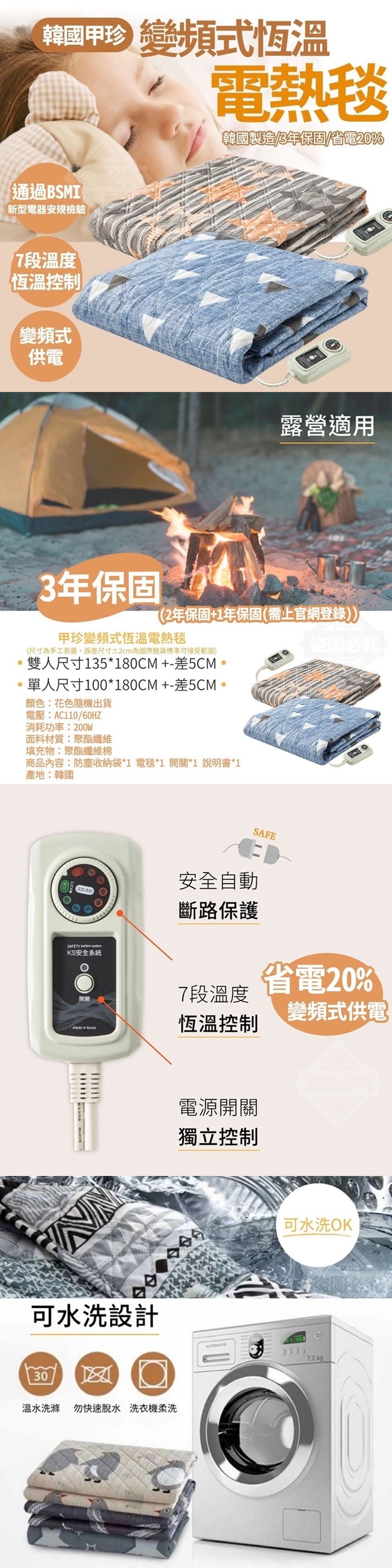 雙人尺寸:135*180cm±差5cm單人尺寸:100*180cm±差5cm顏色:花色隨機出貨電壓:AC110/60HZ消耗功率:200W面料材質:聚酯纖維填充物:聚酯纖維棉商品內容:防塵收納袋*1電毯*1 開關*1 說明書*1產地:韓國(尺寸為手工測量,誤差尺寸±2cm為國際驗貨標準可接受範圍)【商品說明】-