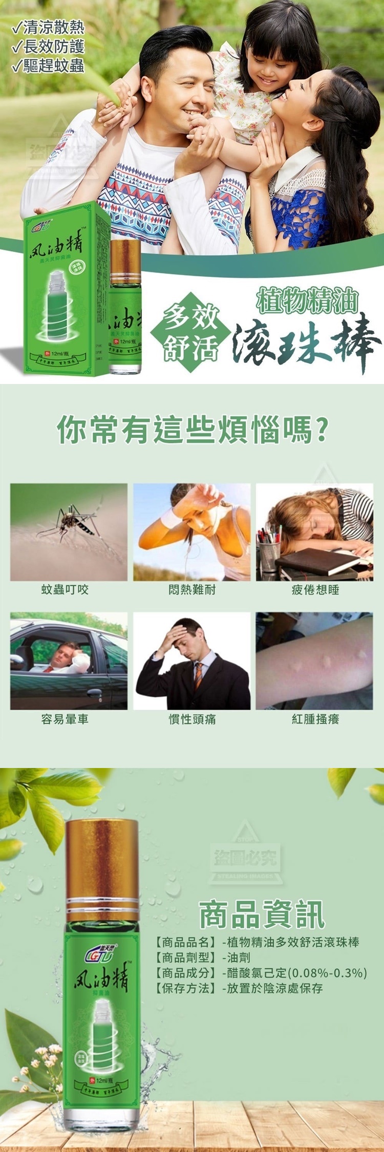 【商品劑型】-油劑 【商品成分】-醋酸氯己定(0.08%-0.3%) 【保存方法】-放置於陰涼處保存 【商品說明】- 你常有這些煩惱嗎? 蚊蟲叮咬 悶熱難耐 疲倦想睡 容易暈車 慣性頭痛 紅腫搔癢 植物精油多效舒活滾珠棒 隨身攜帶 隨時舒活 暈車、頭痛,多種煩惱一抹而空 植物精油 草本配方 植物萃取,一抹清涼好舒爽 薄荷-舒緩頭痛 樟腦-舒緩蚊蟲叮咬不適感 桉葉油-舒緩紅腫搔癢 丁香酚-舒緩暈車不適感 簡單使用 快快舒緩 太陽穴/耳後/人中/手腕/前額/腦後 多處可用,隨心所用