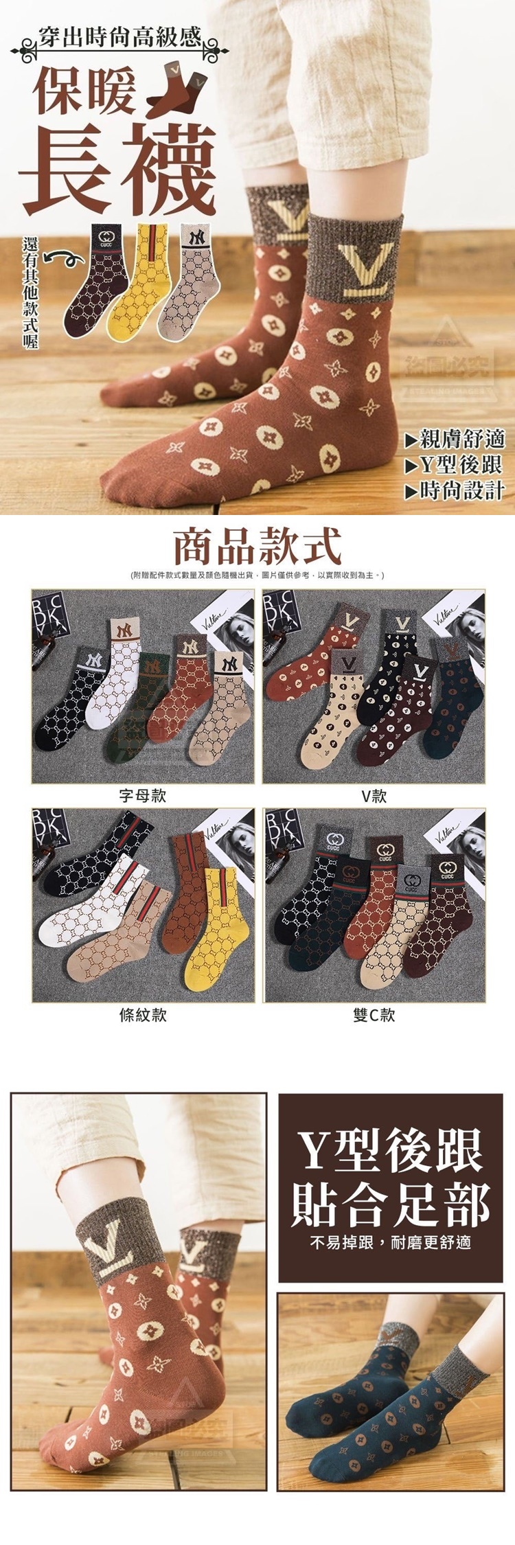 【商品尺碼】-34-41碼 【商品材質】-新疆棉 【商品顏色】-V款/條紋款/雙C款/字母款 (附贈配件款式數量及顏色隨機出貨, 圖片僅供參考,以實際收到為主。) 【商品說明】- 保暖也要講求時尚! 保暖長襪穿出時尚高級感 多種不同款式,隨心搭配 搭出精彩每一天 親膚舒適 腳丫子最知道 舒適不勒腳,行走更舒服 時尚設計 走出潮流 長襪設計加上時尚元素,簡單穿出潮流感 Y型後跟 貼合足部 不易掉跟,耐磨更舒適 時尚達人 我行我素 穿出時尚高級感,展示時尚格調