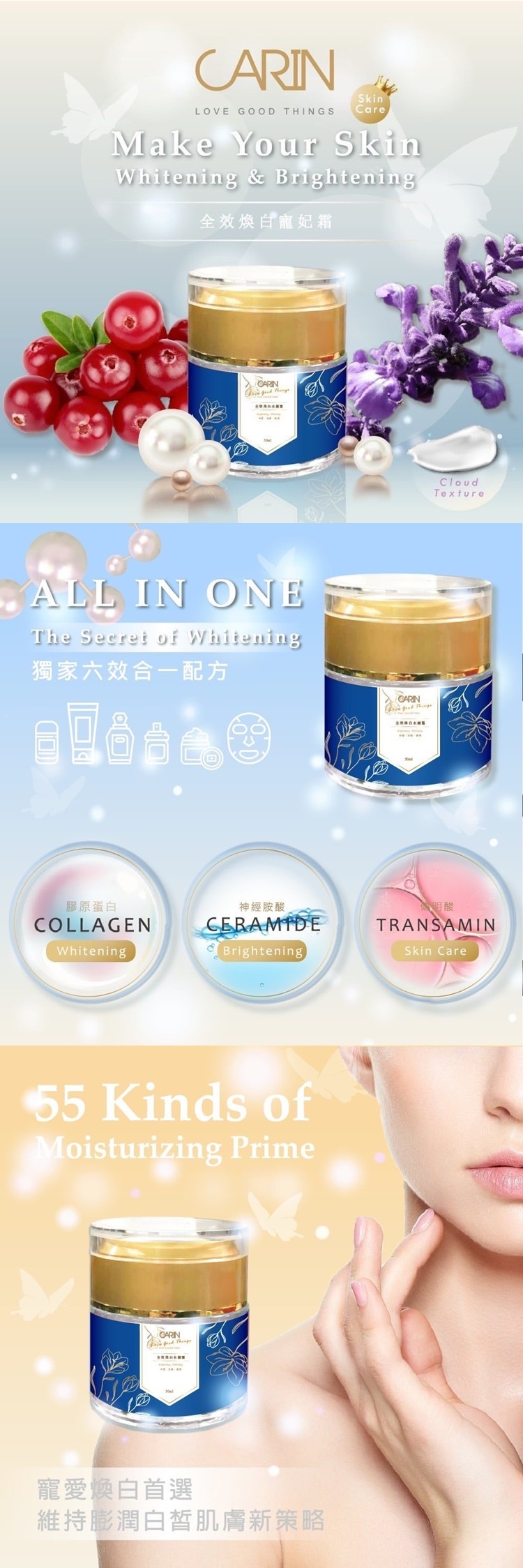 膚色不均超困擾 8週有感,素顏保濕發亮神器~~ 針對亞洲暗沉肌膚所設計的美白定律 一推出,就有很漂亮的成績 1罐有感,2罐改善,3罐成主顧 回購保證款 保濕+美白+彈力 針對亞洲暗沉肌設計 肌膚一旦缺水,更容易加速紫外線吸收 肌膚受到刺激,引發"黑色素"及"皺紋"產生! 高濃度美白注入科技 抑制黑色素+舒緩保濕 從根源阻斷黑色素生成 減少黑色素沉澱 50種美容精華成分 草本舒緩 彈力保濕 超導滲透,深層補水 維持肌膚彈力緊緻 產地:台灣 容量:50g