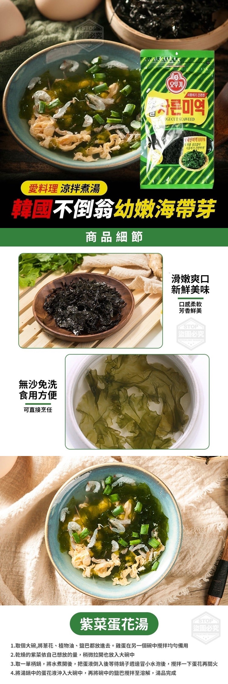 【商品說明】- 韓國不倒翁幼嫩海帶芽 幼嫩海帶芽,新鮮上岸 色澤油亮、氣味芬芳、氣味鮮香~ 海帶嫩芽又稱為裙帶菜 是海洋中高營養價值的天然食品 可作為品、涼拌、拉等料理之食材 如海帶芽味增湯、芝麻海帶芽、 貝帶芽飯、韓式涼拌海帶牙等各式美味佳。 海帶嫩芽不僅可作佳主菜 作為配菜也能為料裡增添口感 賦予佳迷人又富豐的海洋滋味 是您日常廚房料理不可或缺的優良食材! 滑嫩爽口 新鮮美味 口感柔軟,芳香鮮美 鮮甜爽口 口感幼嫩、鮮甜,有一股特有的清香 無沙免洗 食用方便 可直接烹任