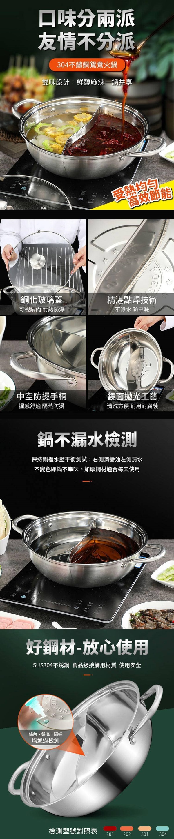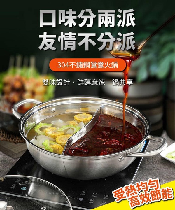 口味分兩派 友情不分派 雙味設計‧鮮醇麻辣一鍋共享 闔家團圓、朋友聚餐, 滿足各種不同需求 怕辣愛辣都沒問題 節能省時速熱 加厚平整鍋底導熱均勻 適用爐具範圍更廣 電磁爐瓦斯爐都行 食品級材質安全放心 SUS304不銹鋼 加厚鋼材適合每天使用 精湛點焊技術 不滲水防串味 鏡面拋光工藝 清洗方便耐用耐腐蝕 中空防燙手柄 握感舒適 隔熱防燙 鋼化玻璃蓋 可視鍋內 耐熱防爆 尺寸 : 直徑32CM(適用4-6人) 材質:鍋身/304不鏽鋼、鍋蓋/鋼化玻璃