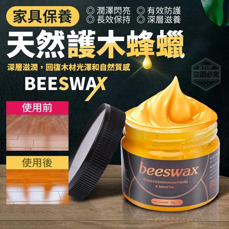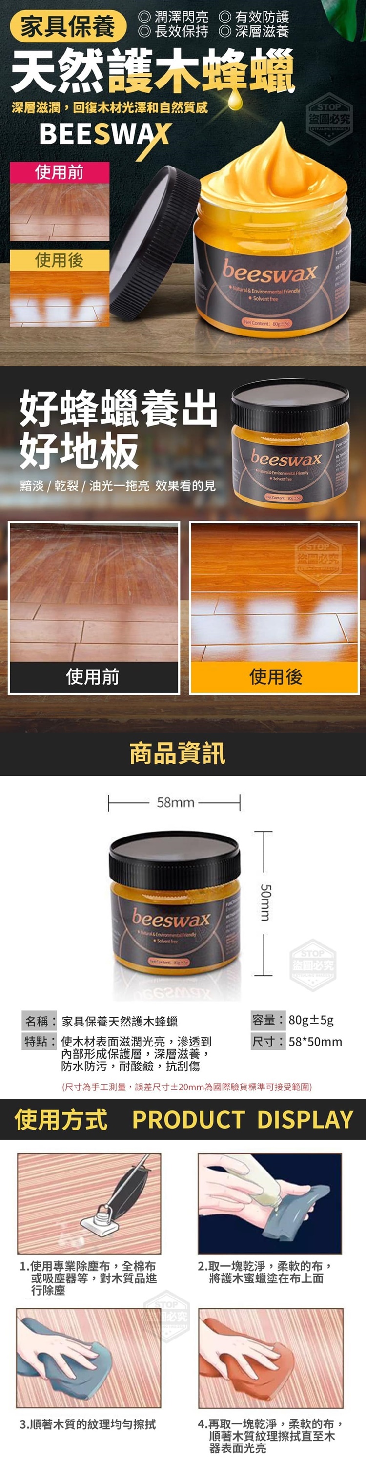 【商品尺寸】-58*50mm (尺寸為手工測量, 誤差尺寸±20mm為國際驗貨標準可接受範圍) 【商品說明】- 家具保養天然護木蜂蠟 使木材表面滋潤光亮 滲透到內部形成保護層 深層滋養,防水防污,耐酸鹼 抗刮傷,回復木材光澤和自然質感~ 黯淡 / 乾裂 / 油光一拖亮 效果看的見,適用家中多種木製品 不止木地板,木質家具,器具皆可用 解決煩人木具問題~ 潤澤閃亮 長效保持 有效防護 深層滋養