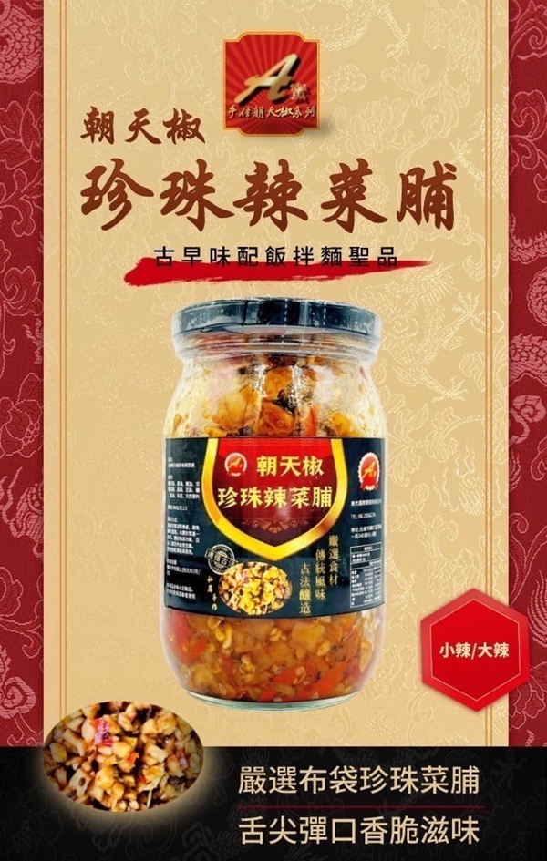 珍珠辣菜脯』,嚴選布袋珍珠菜脯,入口即能感受珍珠菜脯的在舌尖彈口香脆滋味。秉持不死鹹、不死辣、不過甜不添加色素和其他人工添加物。純手工製作,品嘗美味的同時又可以鞏固健康!傳統古早味一匙好美味食用方法: