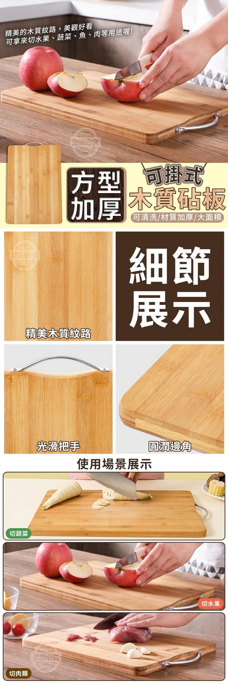 尺寸32x22x1.8cm 【商品說明】- 你家的砧板是不是 太薄、太小、佔位置 換個厚實耐用的好砧板 讓您切菜更順手 可掛式方型加厚木質砧板 表面光滑,木質紋路精美 材質加厚又耐用 面積大,方便又好清洗 是你廚房的好幫手~ 把手設計 精緻的光滑把手 方便提取移動 也可掛在牆上收納起來 不占你多餘空間 也可以靠牆站立擺放喔! 容易清洗 只需用清水沖洗 即可將砧板洗乾淨 大面積設計 拿來切菜、切肉、 切蔬果更方便
