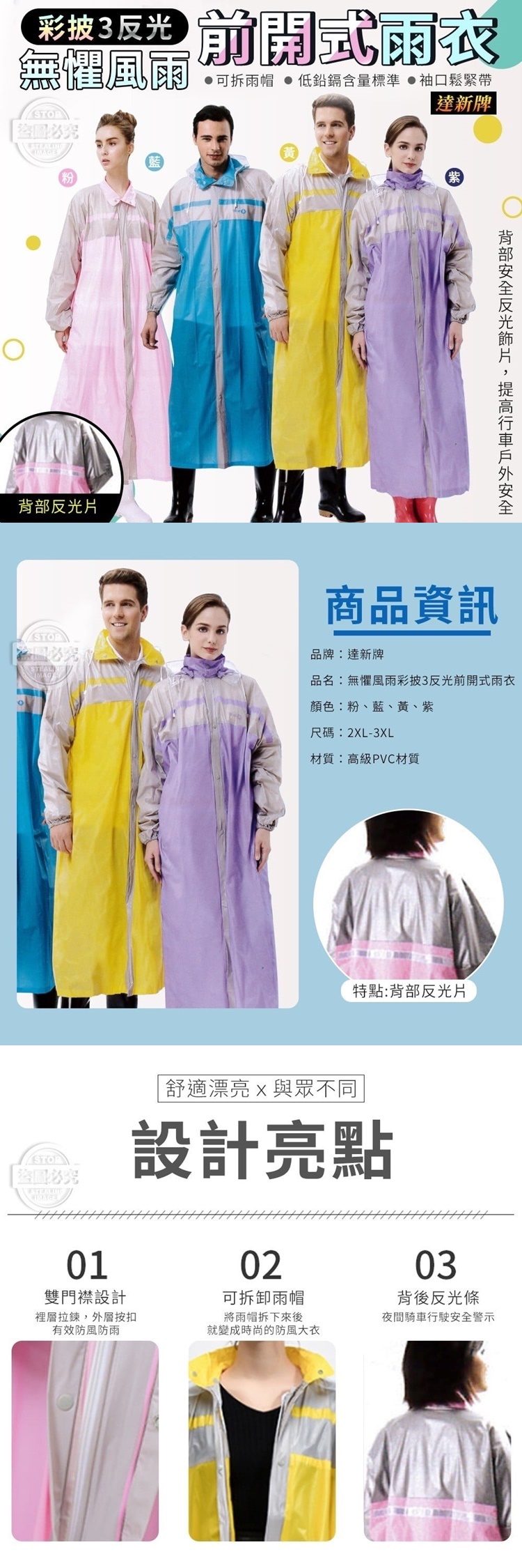 達新牌 無懼風雨彩披3反光前開式雨衣/紫色/2XL