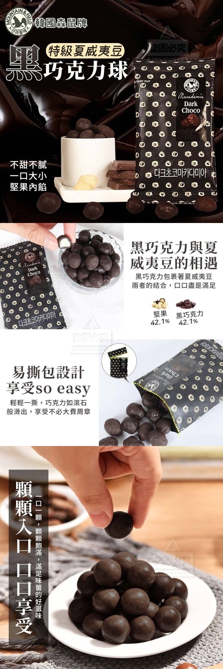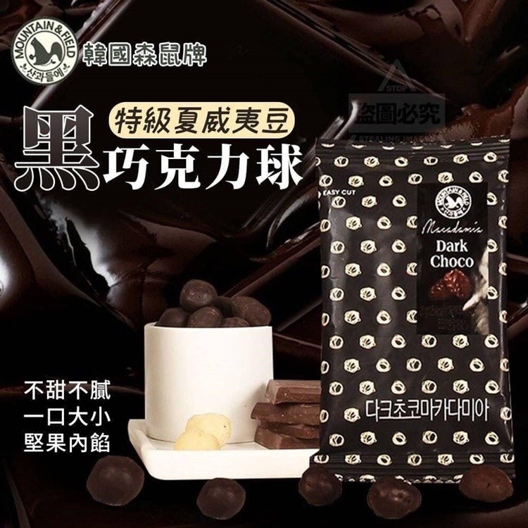 想吃巧克力,又怕太甜?嘗嘗充滿成熟大人味的黑巧克力球韓國森鼠牌特級夏威夷豆黑巧克力球黑巧克力的苦甜帶出夏威夷豆的香甜一口一滿足,粒粒皆幸福易撕包設計 享受so easy