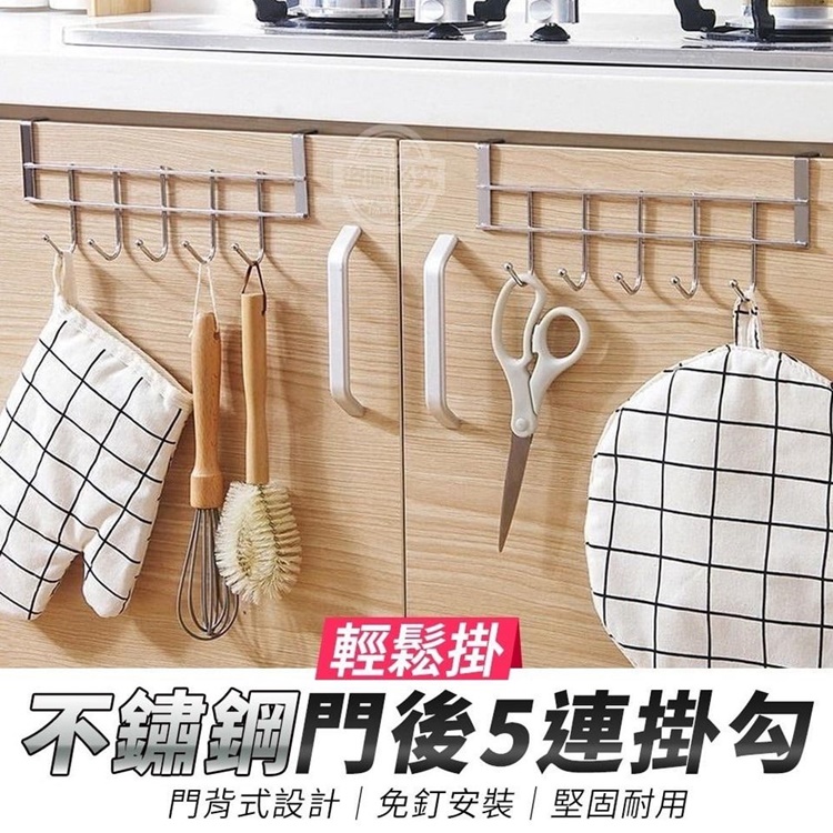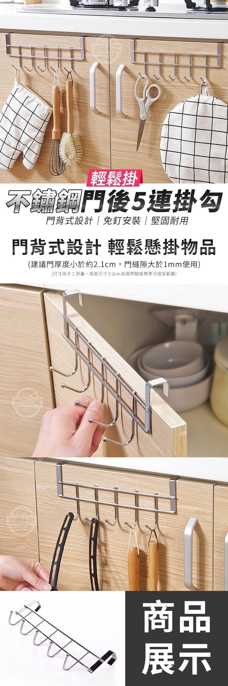 【商品材質】-不鏽鋼 【商品說明】- 想放個收納架,沒空間 輕鬆掛不鏽鋼門後5連掛勾 門背式設計,不需安裝 只需輕輕掛在門上,就可馬上使用 讓您輕鬆懸掛物品 5連鉤設計 優質不鏽鋼,承重性好 廚具、抹布、刷子等 多種物品同時掛 居家收納沒煩惱 可掛在門後或是櫃子的門上 完全不佔作業用的桌面空間喔! 需要的時後隨取隨拿 讓您做事更順手 效率加倍 貼心建議 建議門厚度小於約2.1cm 門縫隙大於1mm使用 影片僅供參考使用方式 所有配件以實際收到為主