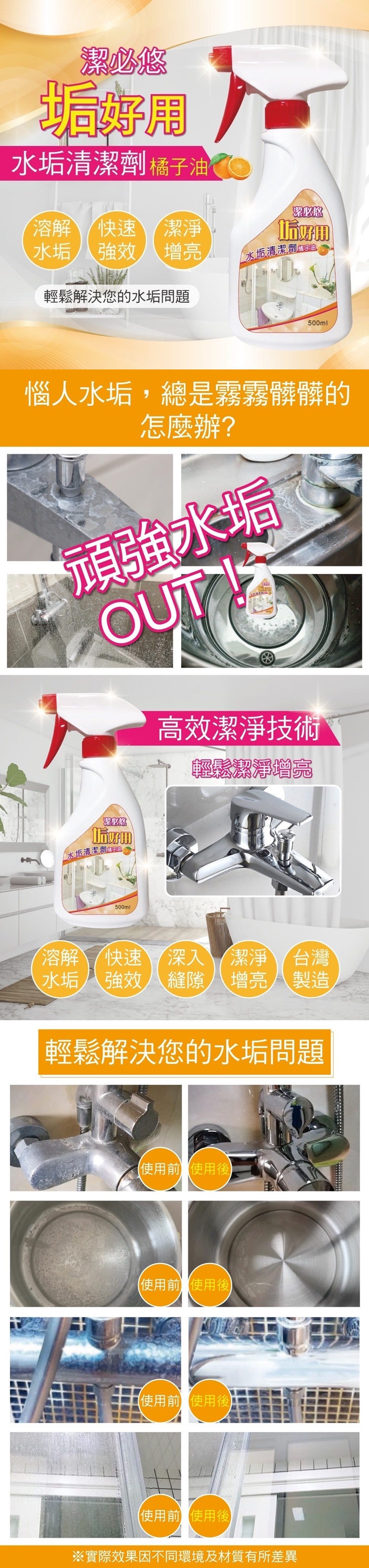 快速溶解水垢!聰明主婦的好幫手主婦們有福啦!!這款垢好用水垢清潔劑能解潔以上所有問題讓您打掃事半功倍,再也不用費時費力輕鬆去除水垢、皂垢、髒汙容量:500ml