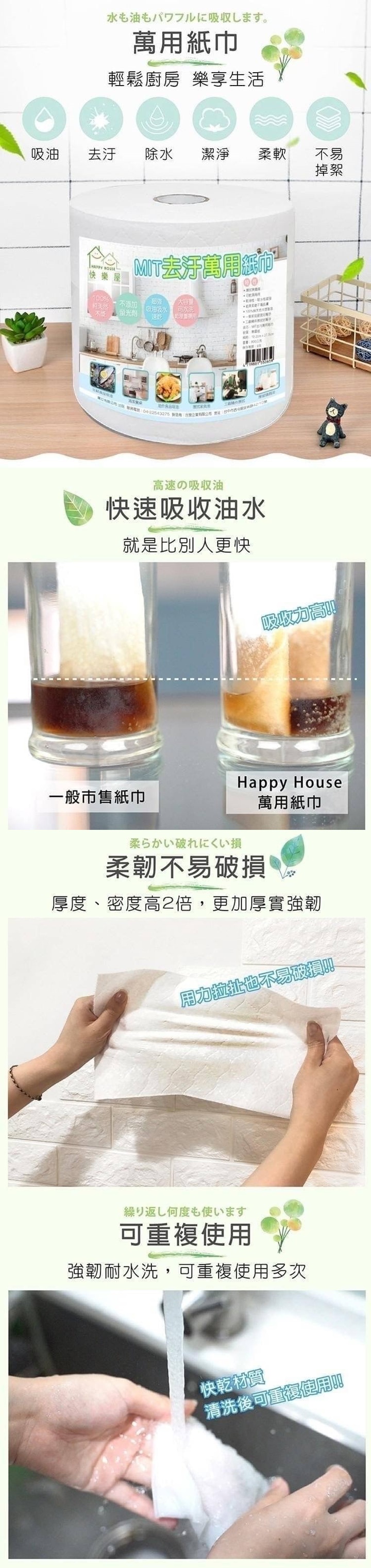 大包裝更便宜!去汙萬用紙巾, 主婦愛用強推! 延展性彈性高,可水洗重複使用。 超強去汙力,清除油垢輕鬆簡單 吸油吸水性超強;乾濕兩用, 廚房、衛浴、車用,都適用 100%純天然木漿製造,是主婦打掃的好幫手。 1.乾濕兩用,可水洗 2.紙張柔韌不傷肌膚,擦拭無塵屑 3.不含螢光劑和有害的化學物質 4.去汙能力強,可使用於廚房、餐桌、 家具擦拭、工廠機件擦拭 材質:100%木漿 保存期限:8年 尺寸:19.2x27.5cm 數量:210抽±3% (約210-230 抽不等) 產地:台灣