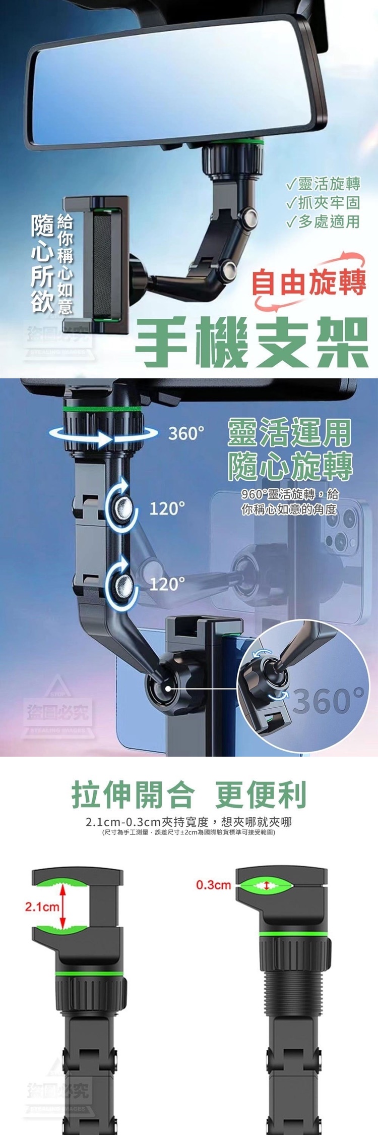 【商品說明】- 雙手沒空卻急需用手機? 自由旋轉手機支架 看導航、看食譜、看影集 解放雙手有一套 靈活運用 隨心旋轉 960°靈活旋轉,給你稱心如意的角度 拉伸開合 更便利 2.1cm-0.3cm夾持寬度,想夾哪就夾哪 抓夾牢固 不易掉落 穩固夾取,不怕容易掉落,使用更安心 多場景適用 汽車後照鏡、拍攝使用、廚房使用 餐桌使用、床上追劇、書桌使用 使用便利,讓居家生活更樂活 影片僅供參考使用方式 所有配件以實際收到為主