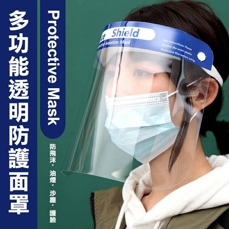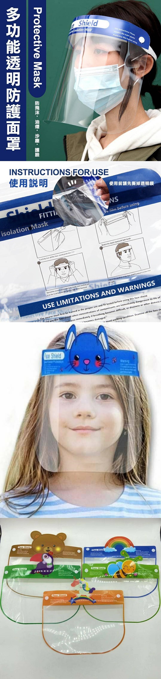 多功能防護面罩,防起霧,防油煙, 防飛沫,灰沙等,飛濺傷害面部及眼部 只擋病毒,不擋視線,多場合使用, 採用柔軟海綿額頭內託不卡臉, 不佔臉,適合大部分人穿戴, 防塵防菌,安全衛士。 尺寸:大人約22*33CM 小孩約18*25CM 重量:30~45G 顏色:大人藍色 小孩卡通款隨機混搭 材質 : PET 款式 : 兒童款 /大人款