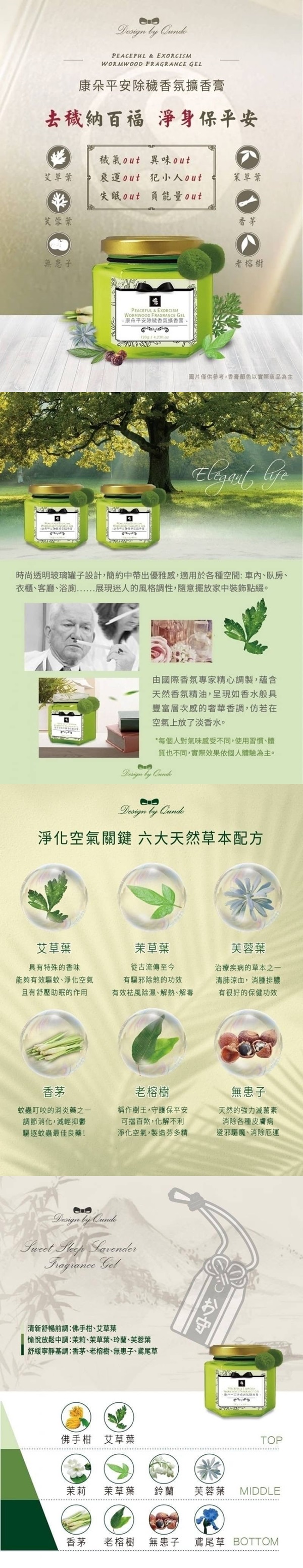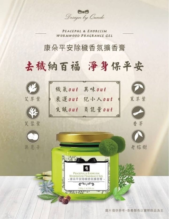 康朵平安除穢香氛擴香膏120G ▲除穢納百福,淨身保平安 ▲萃取六大天然草本配方 ▲能量淨化,遠離負能量, 排除晦氣,改善磁場 ▲凍狀質地自然揮發,不灑出滲漏 ▲時尚透明玻璃罐設計,簡約優雅, 隨意擺放家中裝飾點綴 ▲瓶蓋式設計,打開瓶蓋即可擁抱優雅芳香, 離開空間時輕鬆蓋起 ▲附精心的綁帶球球可以拿來綁頭髮~nice 36罐/箱,50箱/版