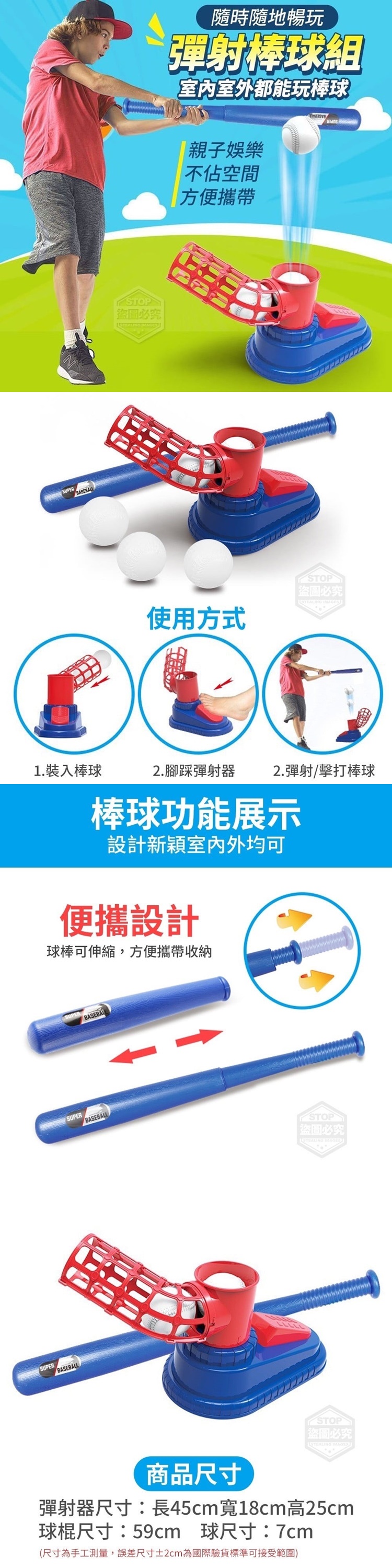 【商品尺寸】-彈射器尺寸:長45cm寬18cm高25cm球棍尺寸:59cm 球尺寸:7cm包裝尺寸:36x14x18.5cm(尺寸為手工測量,誤差尺寸±2cm為國際驗貨標準可接受範圍)【商品說明】-