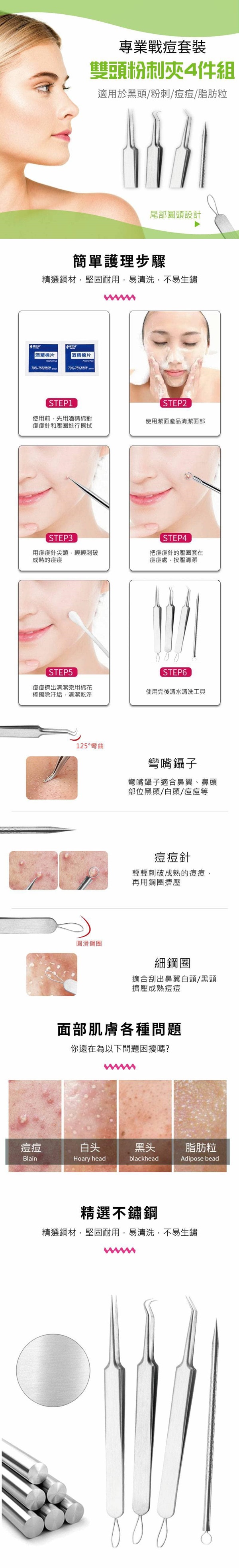 彎頭夾/斜角夾/直角夾+1支針頭 針對各個部位的粉刺做處理 頭部皆有鋼圈可以擠痘 彎頭粉刺夾: 適用於臉部鼻頭平坦處 針對頑固型黑頭和粉刺 適合新手 直角粉刺夾: 適用於表面浮起的小黑頭粉刺 適合處理細小粉刺、黑頭和脂肪粒 斜角粉刺夾: 適用於鼻翼下巴等 粉刺、黑頭、痘痘一網打盡 戰痘不留痕,除痘再也不煩惱 PS:使用完工具記得用酒精片消毒 材質 : 不鏽鋼 尺寸: 如圖