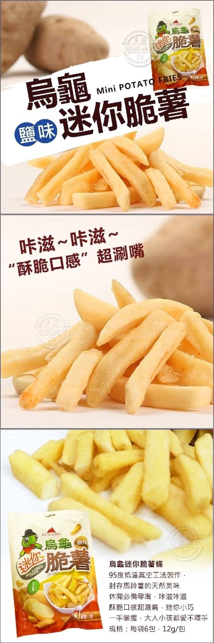 大家最愛的95度C的迷你薯條來囉! 還記得卡迪娜95度C脆薯嗎? 今天推出的新品跟他一樣超級好吃! 烏龜迷你脆薯條隨手包 一人一包剛剛好 95度低溫真空工法製作, 封存馬鈴薯的天然美味,休閒必備零嘴, 咔滋咔滋酥脆口感超涮嘴,迷你小巧, 一手掌握,大人小孩都愛不釋手 規格:每袋6包,12g/包 (全素可食) 保存期限:10個月(都是最新效期)