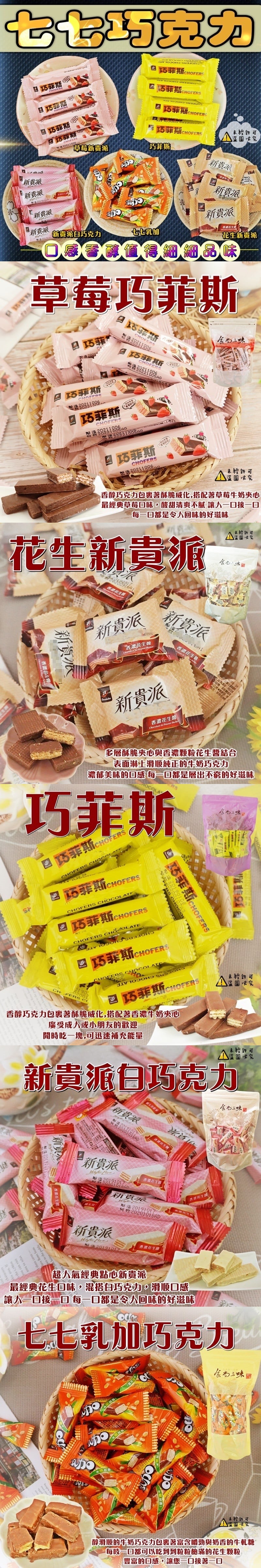 七七乳加600g(70入):香醇滑順的牛奶巧克力包裹著富含嚼勁與奶香的牛軋糖,每咬一口都可以吃到到粒粒飽滿的花生顆粒,豐富的口感,讓您一口接著一口,嚕呷嚕好呷。#奶素新貴派白巧克力600g(70入):