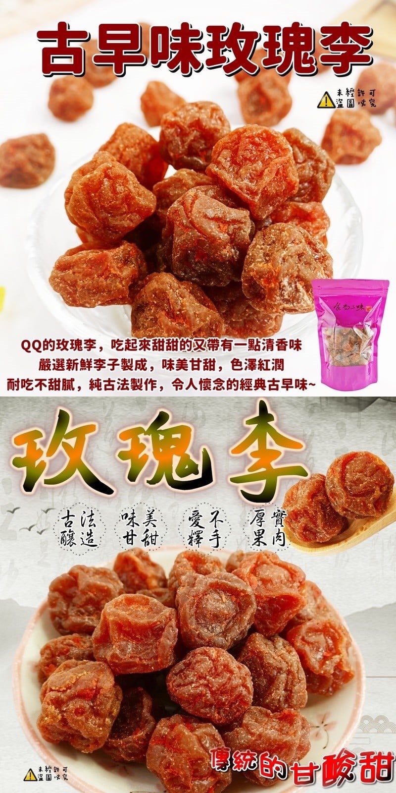 QQ的玫瑰李,吃起來甜甜的又帶有一點清香味,但是以前的年代,蜜餞都會叫OO梅,所以玫瑰李也稱作甘草梅,嚴選新鮮李子製成,味美甘甜,色澤紅潤,酸酸甜甜綿密的口感,保留李子原味及淡淡香氣,耐吃不甜膩,純古法製作,令人懷念的經典古早味~ #全素實際出貨數量還是以重量為主唷