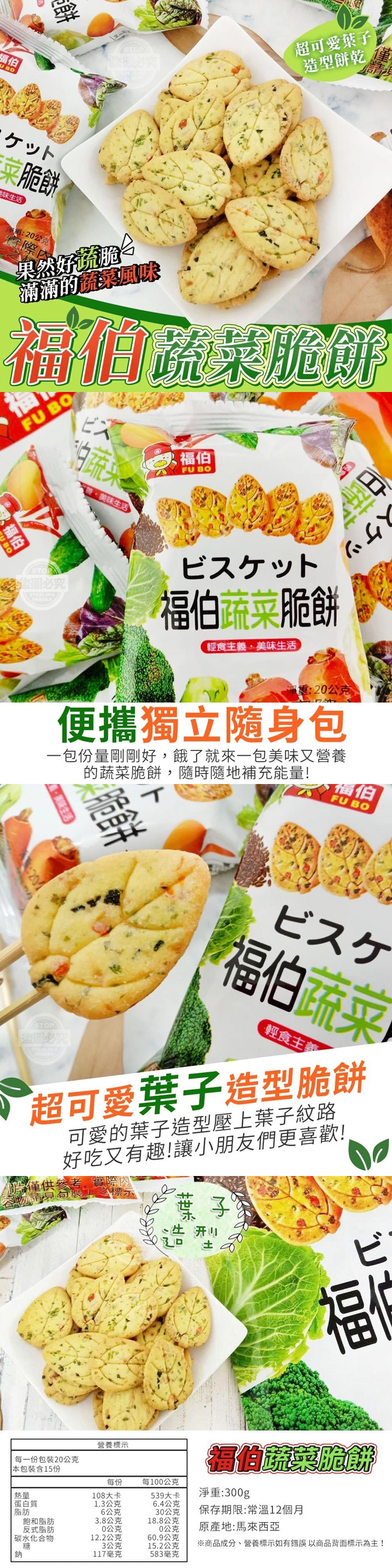 【商品規格】- 重量:300g 產地:馬來西亞 保存期限:12個月 保存方式:常溫 【商品說明】- 來了 超可愛造型脆餅 福伯蔬菜脆餅 清爽又酥脆的餅乾薄片 一口咬下去 清脆的聲響增添幾分口感 淡淡的蔬菜風味 加上黑芝麻點綴 讓食用時又多了幾分香氣 可愛的葉子造型 壓上葉子紋路 好吃又有趣 讓小朋友們更喜歡~ 下午茶、看劇、嘴饞配著吃剛剛好啦!!! 果然好"蔬"脆,滿滿的蔬菜風味! 媽媽再也不用擔心孩子們不吃蔬菜囉