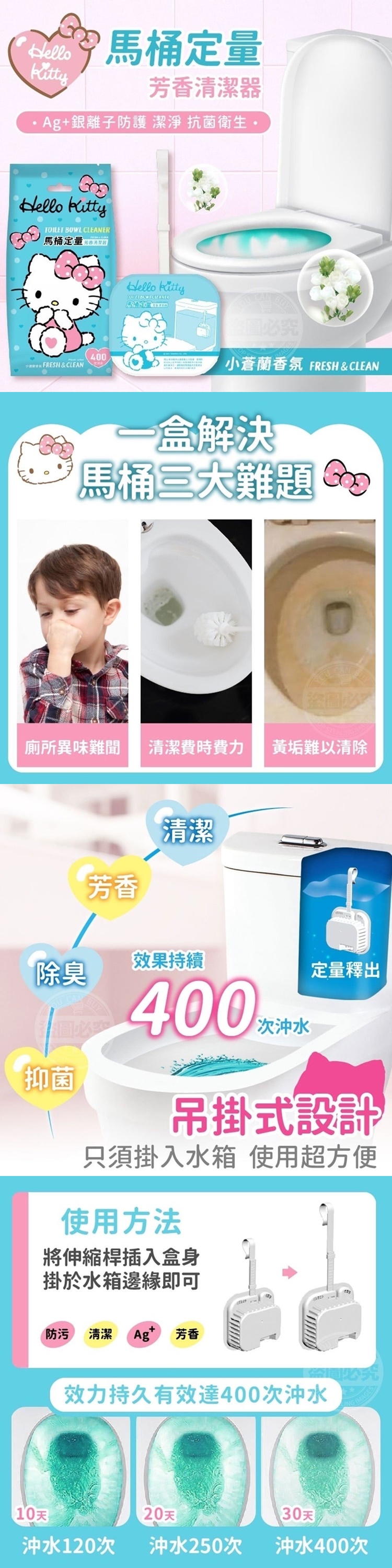 馬桶總是散發出怪味水垢尿垢黃漬難以清除還要辛苦彎腰洗馬桶還不見得乾淨清香真是難受阿...交付給Hello Kitty馬桶定量芳香清潔器