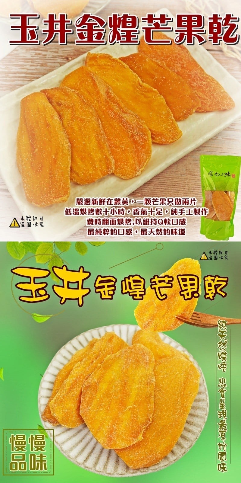 大塊果乾 份量十足 嚴選新鮮在叢黃,一顆芒果只做兩片, 低溫烘烤數十小時,香氣十足, 純手工製作,費時翻面烘烤, 以維持Q軟口感!! 果肉Q甜、香味濃郁,口感紮實 、 纖維細緻 !最純粹的口感、 最天然的味道!! #全素 實際出貨數量還是以重量為主唷 實品顏色跟照片會因燈光.顏色. 手機.電腦因素,難免有色差, 請以收到實品為主喔!! 保存方式:拆封後請盡快食用 避免高溫潮濕、陽光直射, 請放置於乾燥陰涼處所 產地: 台灣 賞味期限:2022/06/24