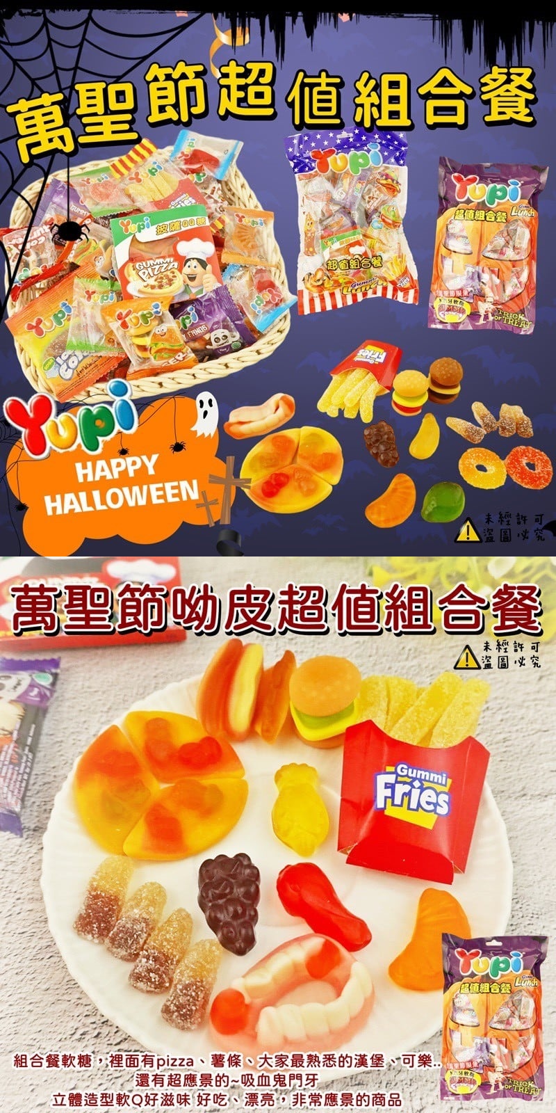 好吃、可愛又應景,萬聖節活動必備組合餐軟糖,裡面有pizza、薯條、大家最熟悉的漢堡、可樂..還有超應景的~吸血鬼門牙,不論學校補習班辦公室任何場所都需要的萬聖節糖果!好吃、漂亮,非常應景的商品~(432g約50入) #葷組合餐糖果:門牙/漢堡/薯條/水果造型/披薩綜合隨機出貨實際出貨數量還是以重量為主唷實品顏色跟照片會因燈光.顏色.手機.電腦因素,難免有色差,請以收到實品為主喔!!貨運出貨壓傷都難免,屬於正常現象,完美主義、高標準者請繞道,下單視同同意保存方式:拆封後請盡快食用避免高溫潮濕、陽光直射,請放置於乾燥陰涼處所產地: 印尼賞味期限:2022/07/10