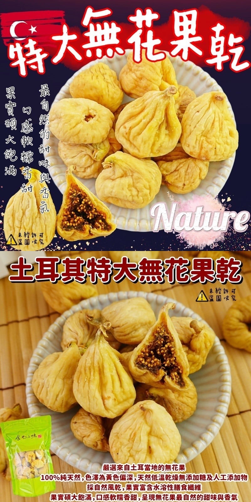 嚴選來自土耳當地的無花果 ,100%純天然,色澤為黃色偏深,天然低溫乾燥無添加糖及人工添加物 !採自然風乾,果實富含水溶性膳食纖維 ,果實碩大飽滿,口感軟糯香甜,呈現無花果最自然的甜味與香氣,吃了好處多多~#全素果乾類屬於天然食品,果乾顏色會變深是自然氧化現象並不影響原有風味,顏色會變深表示本產品無漂白!!實際出貨數量還是以重量為主唷