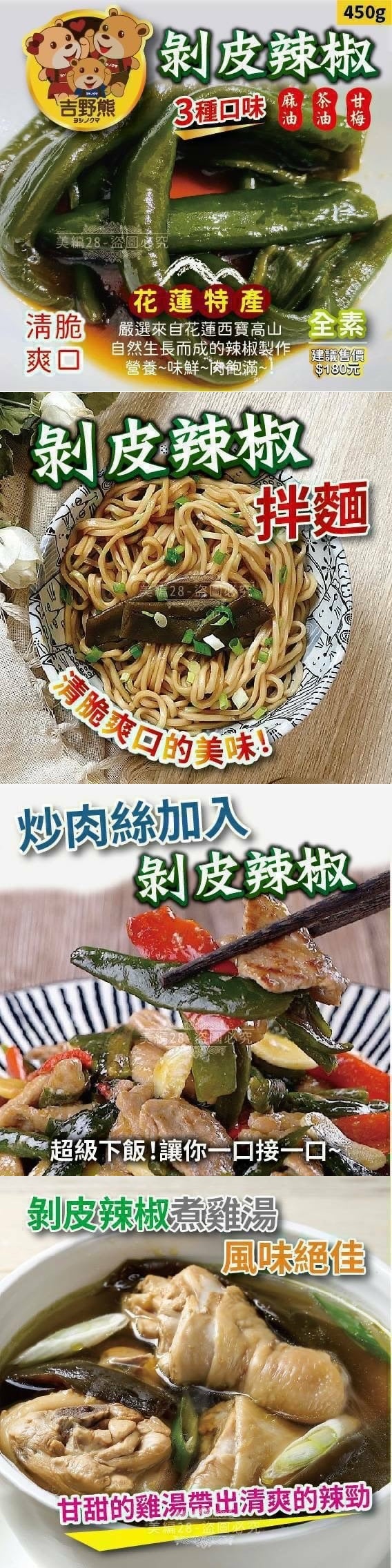 團媽許願 【花蓮伴手禮之~剝皮辣椒】 台灣花蓮特產 剝皮辣椒 來到花蓮必買的伴手禮清單之一 花蓮超知名“剝皮辣椒”, 這團沒跟到會搥心肝呀 婆婆媽媽廚房必備,老老少少敲碗美食 配飯佐餐火鍋的好夥伴 自然甘甜 獨特香醇 最常看到的 剝皮辣椒雞湯 加上這一瓶, 真的是讓人情不自禁的流口水呀 一口接一口的 直到整鍋喝完的魅力 (超暖心) 微辣且回甘真的是超美味的湯品 想喝雞湯怕太躁太油膩嗎? 花蓮特產剝皮辣椒 解決你的煩惱 溫和口感 不躁熱不油膩 大人小孩都無法抗拒的美味 商品資訊 容量:450ml