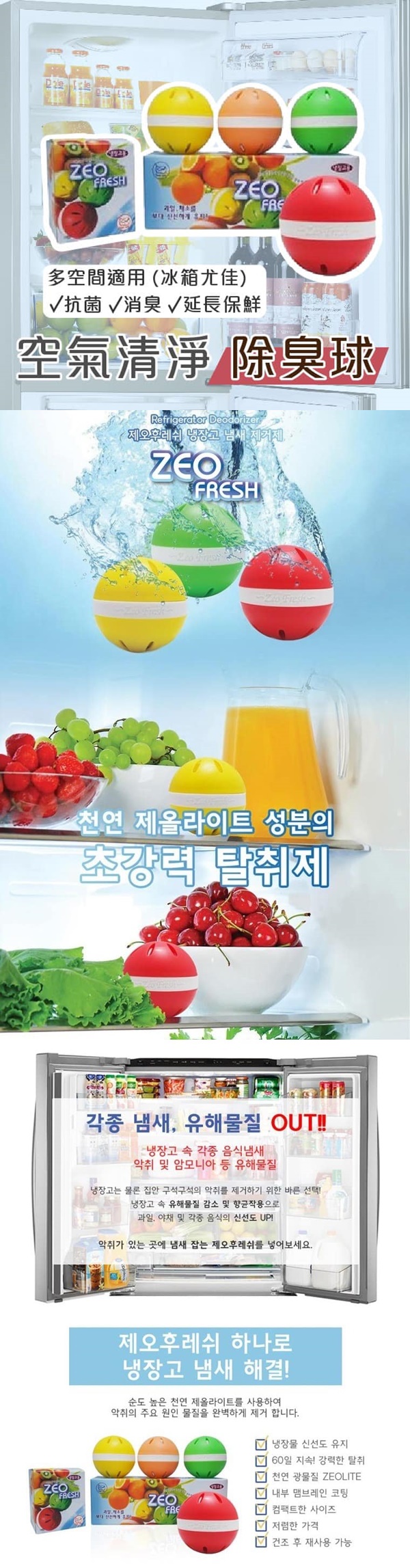 冰箱裡面放了許多食物 時間一久容易殘留異味 打開門的那瞬間簡直快暈倒了!! 冰箱空氣清淨除臭球 小巧可愛的設計,可以放在冰箱各處 讓你整年冰箱都乾淨無臭味 使用天然沸石晶體,可吸附臭味 超強大除臭效果, 抗菌、吸附多餘水氣 隨時保持乾燥,食物才不容易腐壞 放置生鮮蔬果旁, 可延長蔬果的保鮮度喔!! 除了冰箱,也能放在衣櫃、 鞋櫃,去除霉味 一顆可維持60天 60天後可取出曬過太陽除掉多餘的水分 曬乾後可再重複使用,最多可使用1年 單顆直徑:5.5cm/顏色隨機/無香味