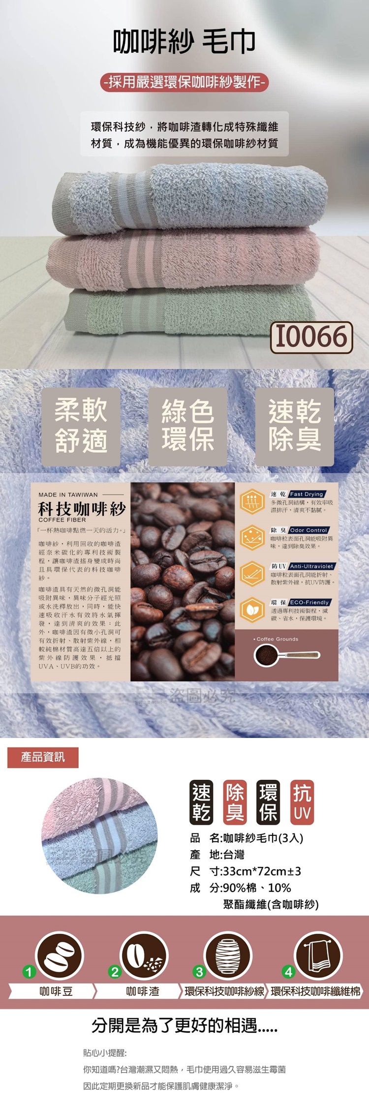 洗臉也可以環保愛地球 獨家黑科技咖啡紗 利用咖啡渣奈米碳化專利技術 獨家專利抑菌抑臭 輕薄透氣速乾不潮溼 柔軟細緻寶貝肌膚 採用天然原棉織造 不含游離甲醛不傷肌膚 台灣製造優質嚴選 貼心小提醒 新買商品使用之前 建議先獨立洗滌一次 洗滌後纖維會變軟,吸水性也會更好 洗滌後掛於通風乾燥地方 清洗時請勿使用柔軟精、 漂白劑成分之洗滌劑 毛巾建議3 - 4個月更換一次 如果有不小心鉤紗, 可自行用剪刀小心剪除 尺寸:33cm*72cm±3 成分:90%棉、10%聚酯纖維(含咖啡紗) 產地:台灣 顏色:比照圖片 一包3入裝 #毛巾 #洗臉巾 #咖啡紗 #速乾不潮溼 #抑菌抗臭