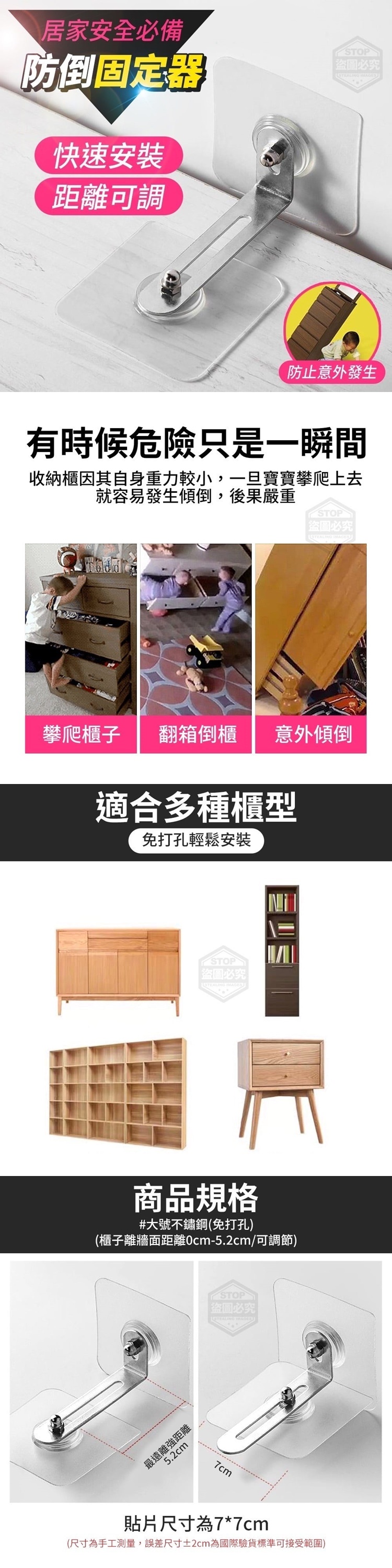 【商品材質】-不鏽鋼 【商品尺寸】貼片尺寸為7*7cm (尺寸為手工測量, 誤差尺寸±2cm為國際驗貨標準可接受範圍) 【商品說明】- 有時候危險只是一瞬間… 寶寶爬到櫃子上,櫃子與人一同傾倒! 這樣的後果不堪設想!! 居家安全必備防倒固定器 防止意外發生!解決家具傾倒隱患 強力穩固,將櫃子牢牢鎖住! 櫃子離牆面距離0cm-5cm/可調節 適合多種櫃型,免打孔輕鬆安裝 快速安裝 距離可調 守護安全