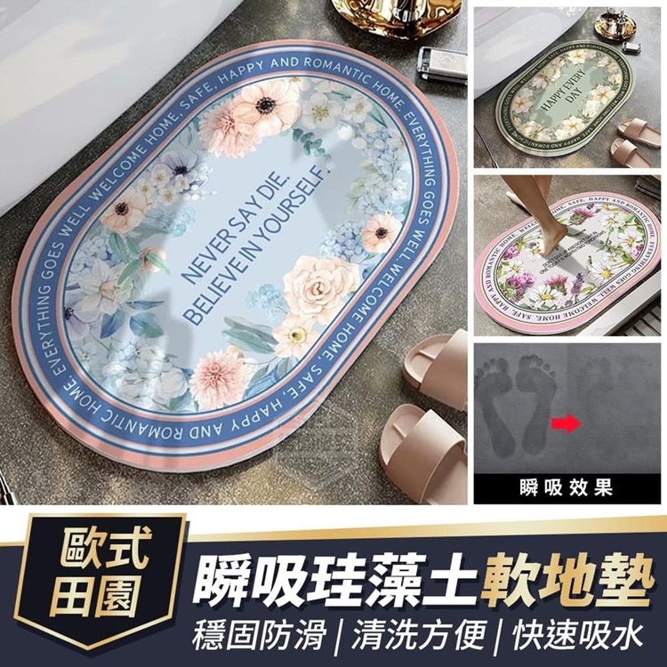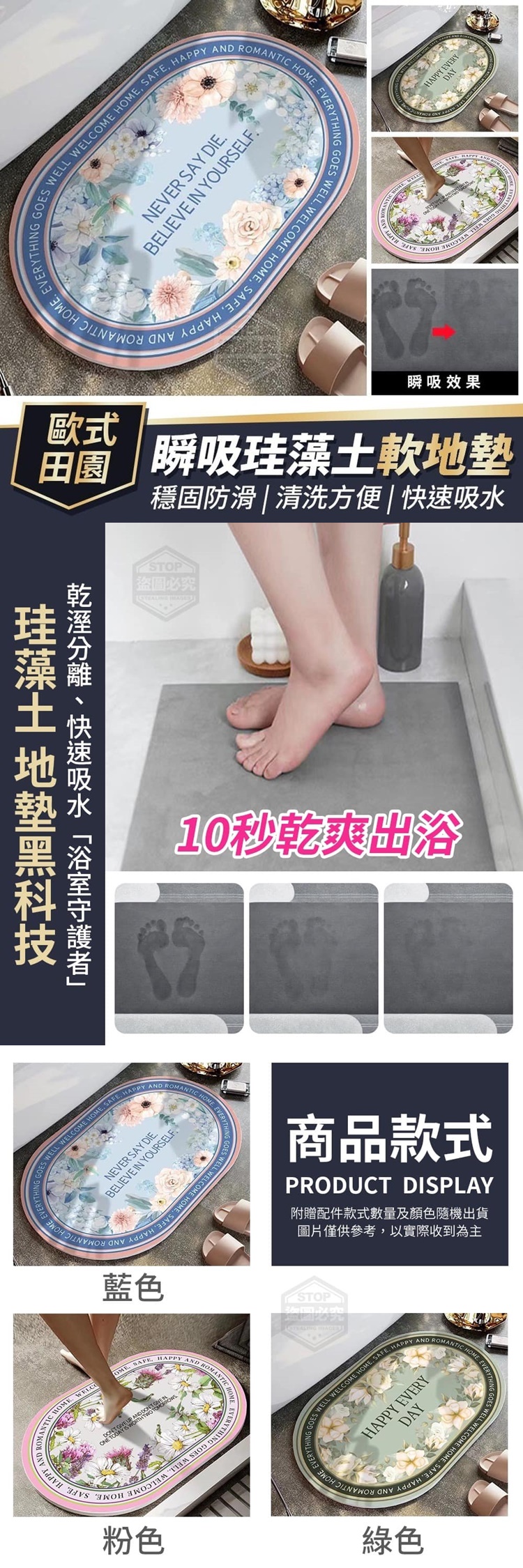 【顏色】-藍色、粉色、綠色(缺款隨機) 【商品尺寸】-40*60cm 【商品顏色】-藍色、粉色、綠色 附贈配件款式數量及顏色隨機出貨, 圖片僅供參考,以實際收到為主。 【商品說明】- 超吸水地墊黑科技 歐式田園瞬吸珪藻土軟地墊 乾溼分離、快速吸水 「浴室守護者」10秒乾爽出浴 快速吸水 腳底速乾 告別腳底濕漉漉,防止水踩到地板上 易擦洗很好打理 少許灰塵可以用吸塵器, 遇到油污也很好清洗 可以加上少許洗潔精用水沖洗即可 多種場景適用 洗手間、床邊、浴室、陽台隨你放 穩固防滑 清洗方便 快速吸水