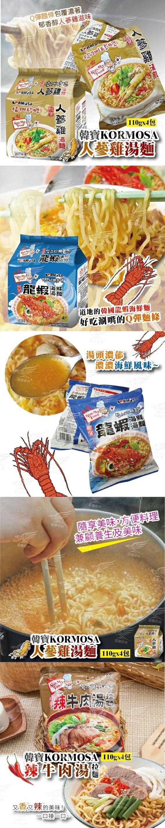 A:龍蝦海鮮湯麵 B:辣牛肉湯麵 C:人蔘雞湯麵 今天想吃什麼麵呢 #韓國來的好朋友 超熱銷風靡世界的韓國泡麵, 精選超人氣的三種口味,讓你食指大動 濃郁的湯頭,麵條Q彈CP值破表 肥美頂級龍蝦,搭配熬煮的鮮美湯頭, Q彈的麵條久煮不爛,讓人回味無窮 辣牛肉製成的香辣高湯, 搭配嚼勁十足的麵條, 大口享受辣到飆汗的快感 以最方便的方式, 享受到韓國養生人蔘雞湯的傳統風味 ※最新效期※