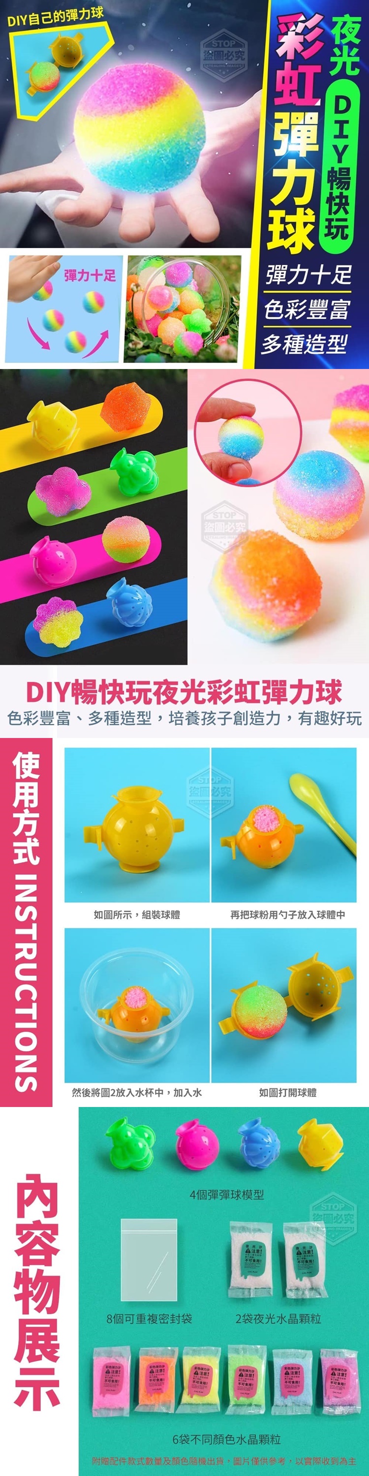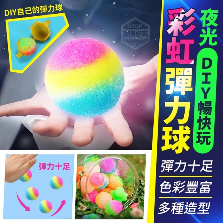 【商品說明】- 玩過彈力球!但你動手製作過彈力球了嗎!? 單色、要漸變色,由你決定通通都沒問題 還具有夜光效果、色彩豐富、多種造型 培養孩子創造力,有趣好玩 讓孩子們製作自己的彈力球的創意 教育工具包,可讓您的孩子在玩耍時 發展基本技能, 同時鍛鍊他們的手眼協調能力 創造力和想像力新奇又好玩 夜晚發光 夜光效果,夜裡可以發出螢光 彈力強,彈性十足 力度不同、彈性不同,摔得越重彈得越高 彈力十足 色彩豐富 多種造型 影片僅供參考使用方式 所有配件以實際收到為主