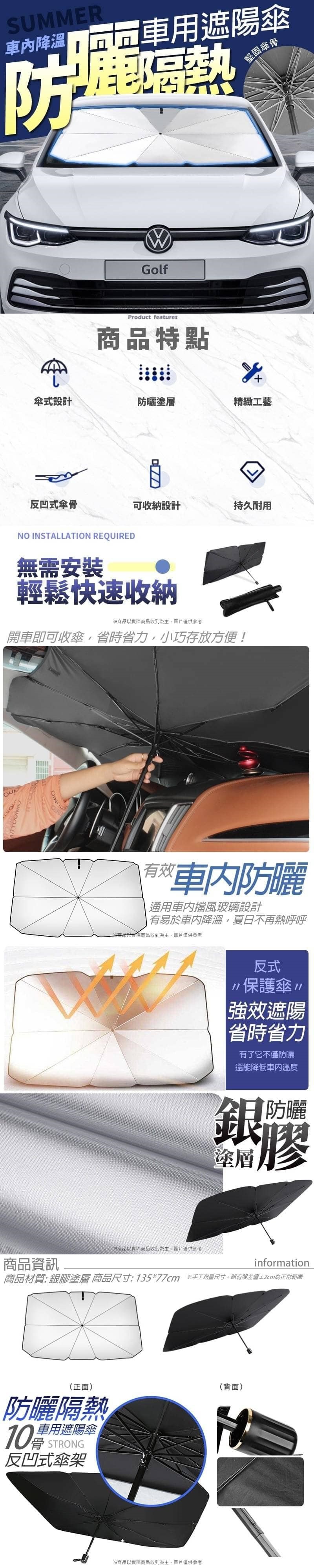 【商品資訊】 商品包裝: 單個布套/opp 商品材質: 銀膠塗層 商品尺寸: 135*77cm ※手工測量尺寸, 略有誤差值±2cm為正常範圍 ✦商品說明✦ 你還在為夏天車內高溫煩憂嗎? 有了它不僅防曬,還能降低車內溫度! 強大隔熱能力,適用多款車型 無須安裝,輕鬆收納 開車即可收傘,省時省力,小巧存放方便! .99%紫外線阻隔,真正防曬 .伸縮收納方便 .幫助車內降溫,涼快舒適 【產地】中國 ※附贈配件款式數量及顏色隨機出貨, 圖片僅供參考,以實際收到為主 https://youtu.be/3_wqxV-DLoo