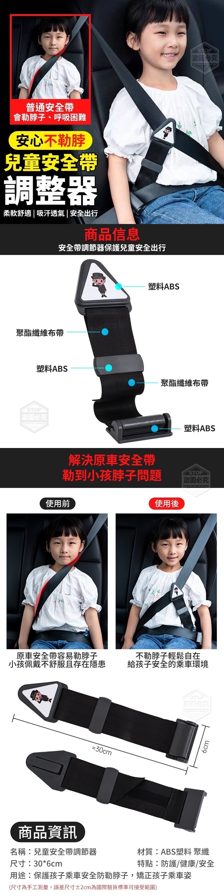【商品材質】-ABS塑料,聚纖 【商品尺寸】30*6cm (尺寸為手工測量, 誤差尺寸±2cm為國際驗貨標準可接受範圍) 【商品說明】- 原車安全帶容易勒脖子、呼吸困難 小孩佩戴不舒服且存在隱患 安心不勒脖兒童安全帶調整器 解決原車安全帶,勒到小孩脖子問題 保護兒童安全出行 給小孩一個安全的環境 雙向固定設計,牢固穩定不易脫落 可根據身高調節長短 適用3-5歲兒童,任意座位均可使用 安裝簡單,安心不勒脖 柔軟舒適 吸汗透氣 安全出行 影片僅供參考使用方式 所有配件以實際收到為主