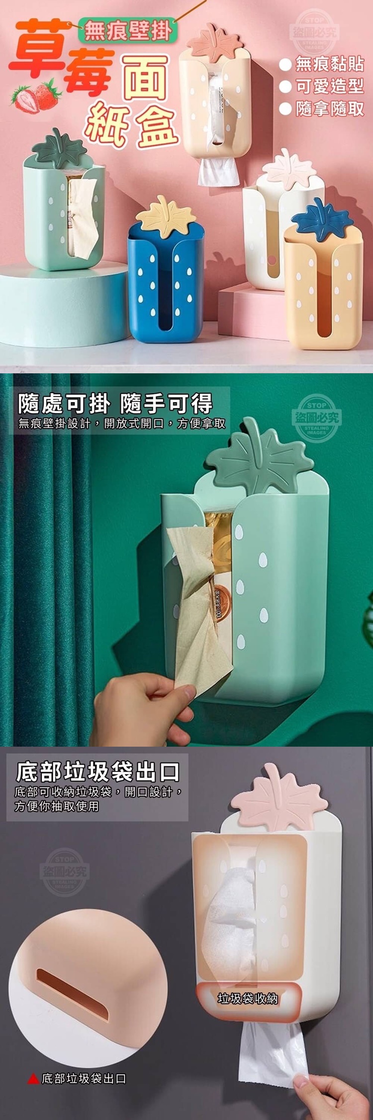 (附贈配件款式數量及顏色隨機出貨, 圖片僅供參考,以實際收到為主。) 【商品說明】- 草莓無痕壁掛面紙盒 甜美的草莓造型,柔和的配色 放在家中任何地方甜美又百搭 不僅好看也很實用 大開口設計 方便替換面紙,且抽紙順暢 壁掛式設計 可掛在家中任何地方 讓你隨手可得 不用煩惱沒地方可以放喔! 無痕安裝 不傷牆,一撕一貼即可完成 真的是很簡單 底部有個收納垃圾帶的空間 下面還有專為垃圾帶專用得抽取口 不管能放衛生紙,還能收納垃圾袋 多種實的功能 真的是超貼心的啦!!