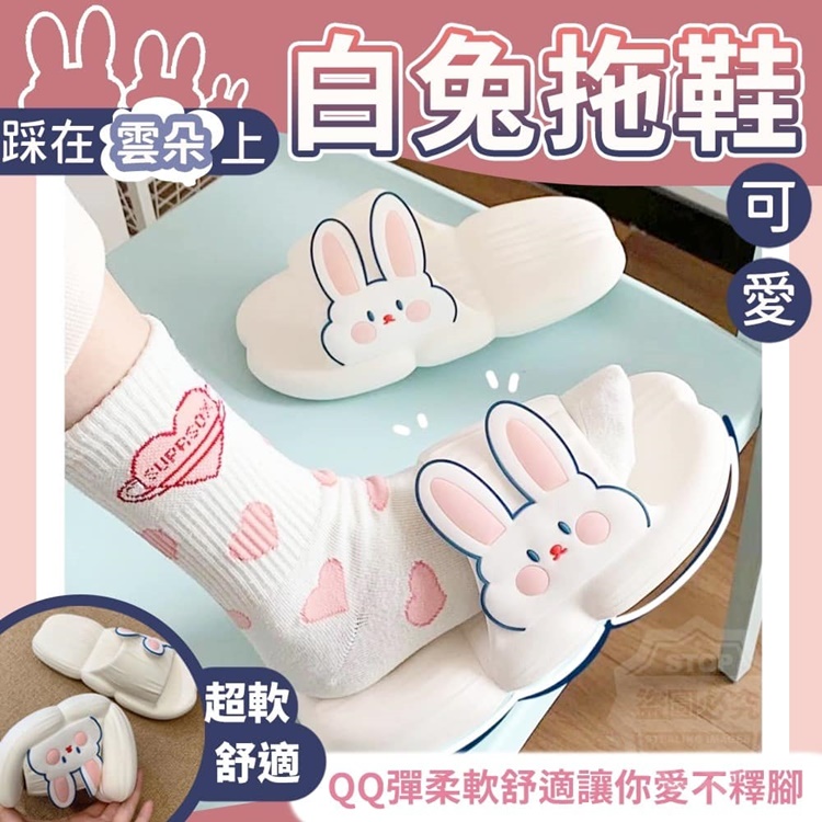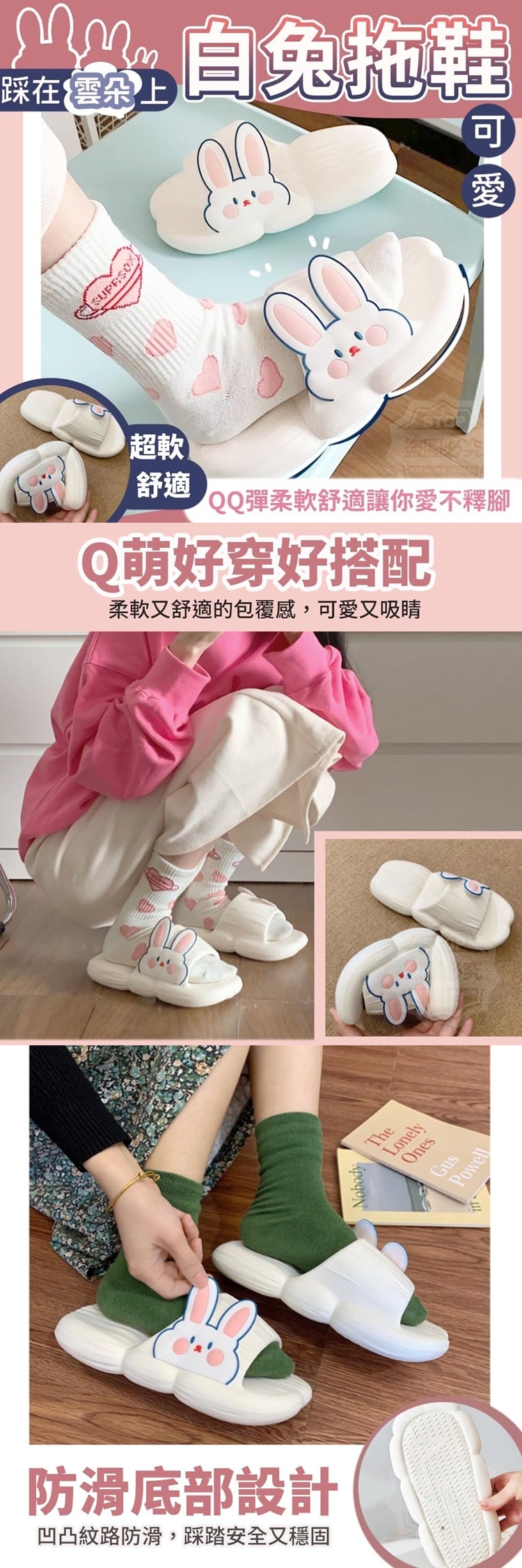 尺寸可挑 36/37 38/39 40/41 三碼 【商品材質】- PVC 【商品說明】- 踩在雲朵上可愛白兔拖鞋 超軟!! 舒適~~ 超可愛小兔子 好看好穿! 方便好用又可愛 就像是踩在雲朵上~~ 軟軟的感覺 真的太舒服了拉! PVC一體成型 厚底增高3CM QQ彈柔軟舒適讓你愛不釋腳~ 凹凸曲線~防滑底部~ 抓地力強,不打滑! 讓生活更美好吧~~ 影片僅供參考使用方式 所有配件以實際收到為主