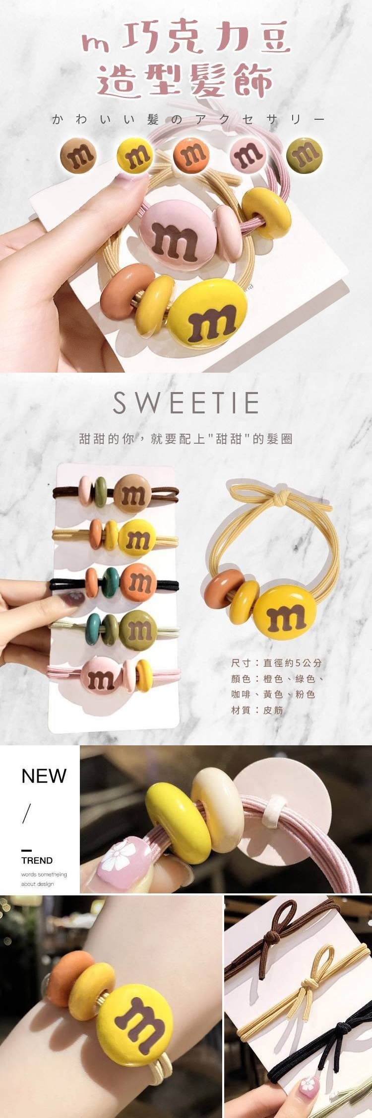吃貨連髮繩都要巧克力造型噠 甜甜的你,就要配上"甜甜"的髮圈 簡約又可愛甜美 可當髮飾也可當手飾 多種顏色隨心而戴 簡單搭配就很好看 顏色:橙色、綠色、咖啡、 黃色、粉色各1(遇缺隨機) 材質:皮筋 尺寸:直徑約5公分