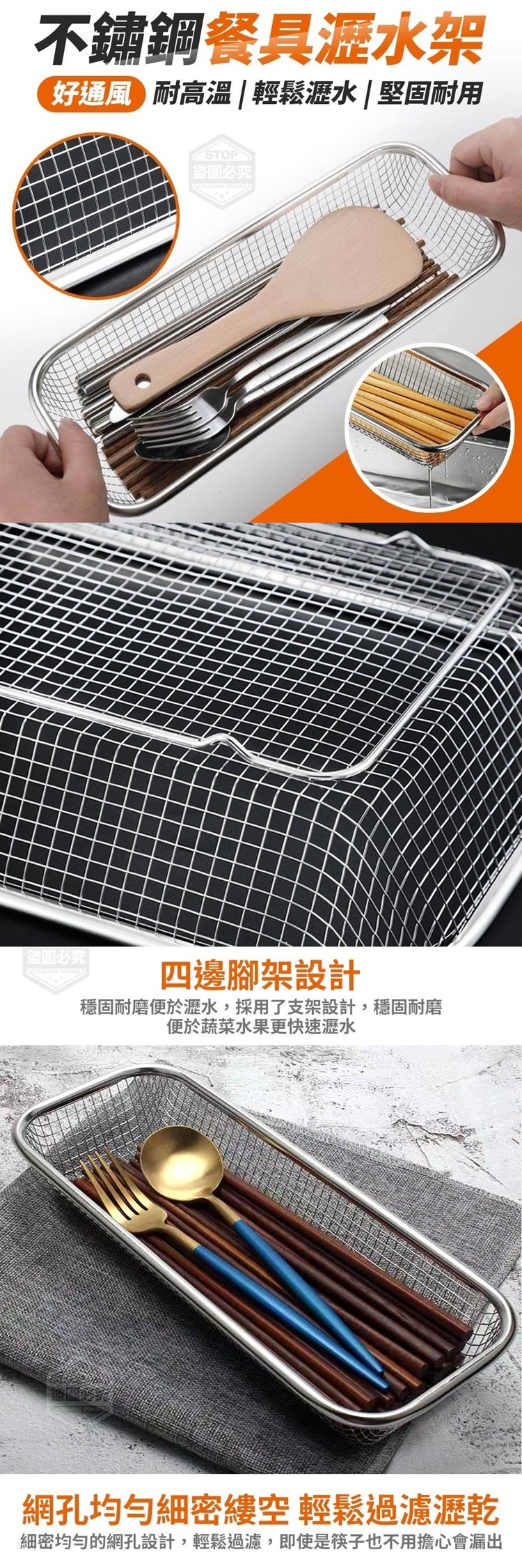 【商品尺寸】-30*12.5*5.5cm 【商品材質】-201不鏽鋼 【商品說明】- 筷子蔬果碗碟洗好沒地方晾乾? 有了他,一切問題都能迎刃而解 好通風不鏽鋼餐具瀝水架 網孔均勻細密縷空,輕鬆過濾瀝乾 細密均勻的網孔設計,輕鬆過濾 即使是筷子也不用擔心會漏出 四邊腳架設計,穩固耐磨便於瀝水 採用了支架設計,穩固耐磨 便於水果蔬菜更快速水, 擺放瀝水餐具等 您多功能的廚房好幫手~ 網孔均勻 輕鬆瀝水 堅固耐用