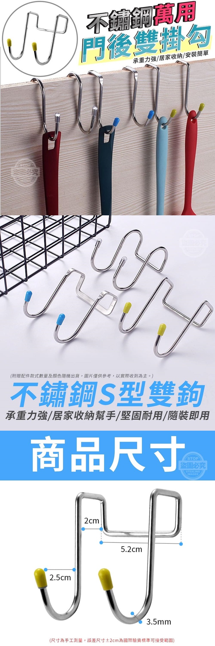 【商品材質】-不鏽鋼 【商品尺寸】-寬:5.2cm (尺寸為手工測量, 誤差尺寸±2cm為國際驗貨標準可接受範圍) 【商品說明】- 居家收納好幫手 不鏽鋼S型雙鉤 一架雙掛鉤設計 可掛在門後及桿子上 隨裝即用不佔空間 可掛放抹布、袋子鍋鏟等物品 隨掛隨取,方便超好收納 廚房、臥室、客廳、浴室等都用的上 貼心的保護套設計 光滑圓潤,有效避免 刮傷衣物、圍巾等衣物不鉤纏 使用堅固耐用的不鏽鋼材質, 承重力強,不怕支撐不住掉落 輕鬆幫你增加居家收納空間 影片僅供參考使用方式 所有配件以實際收到為主