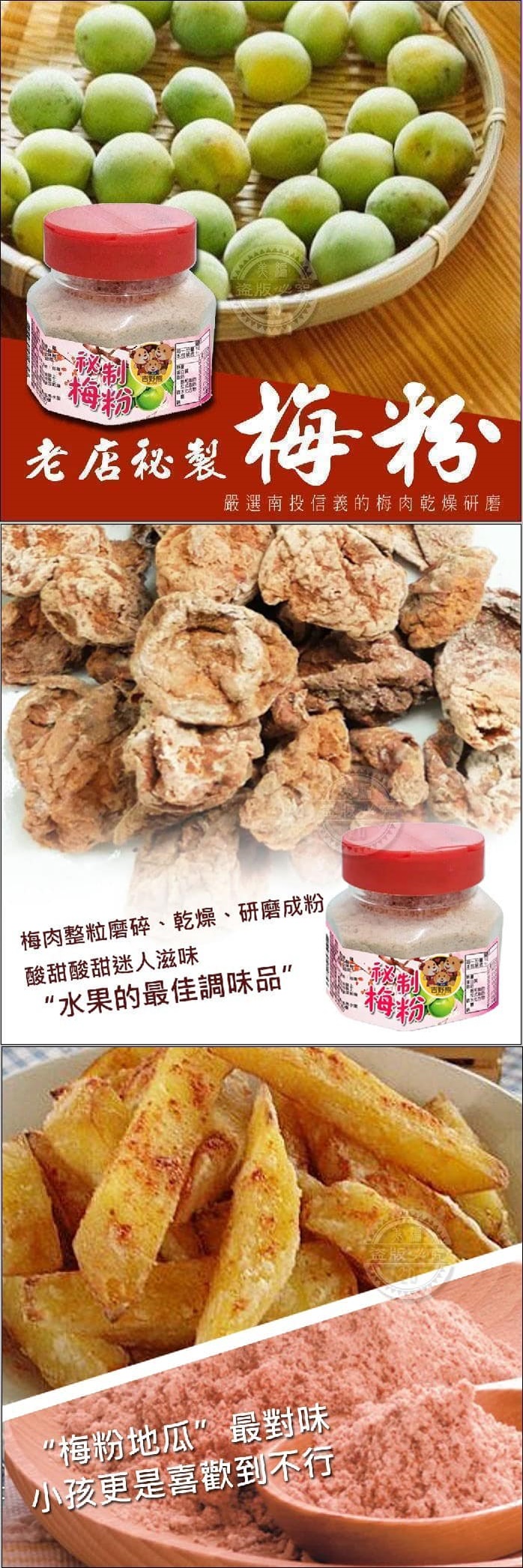 甘甘甜甜的梅粉~~~ 沾著各種水果鳳梨、番茄什麼都百搭 梅粉地瓜最對味 小孩更是喜歡到不行 秘製的這一款甘草梅粉 不會過於死鹹甜 回甘好滋味!!! 使用黃金比例的上等甘草粉、 嚴選南投信義鄕的梅子研磨成粉, 韻味十足~~ 產地:台灣 重量 : 150g 保存期限:一年 保存方式 ▲拆封後記得裝入罐中保存, 記得瓶蓋鎖緊放置陰涼處 儘速食用完畢才不會受潮唷!!